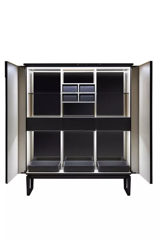 Бар Fidelio high привлекает внимание благодаря своему нарочито чистому дизайну. Он легко впишется в любой интерьер, создавая атмосферу уюта и респектабельности. Утопленные ручки, изящно интегрированные в поверхности, становятся не только функциональными, но и стильными элементами. Контраст теплых темных тонов седельной кожи и дерева с ярким натуральным кленом внутри создает удивительную игру света и тени, подчеркивая элегантность и утонченность.