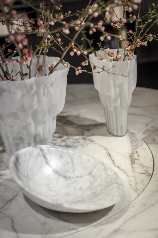 Каждая чаша Pura изготавливается из высококачественного мрамора, который обрабатывается с применением станков с числовым программным управлением. После этого мрамор разглаживается вручную, чтобы достичь полуполированной отделки, сохраняющей его естественный вид. На нижней стороне чаши выгравирована круглая латунная тарелка с рутениевой отделкой, на которой размещены подпись дизайнера и логотип Poltrona Frau. Это подчеркивает не только статусность, но и эксклюзивность данного предмета.