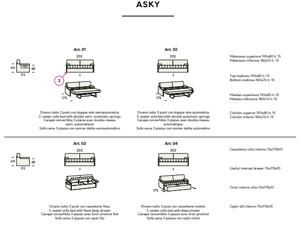 Asky — это не просто диван, это настоящая душа кровати, которая сочетает в себе стиль и практичность. Его утонченные линии и гармоничные формы идеально впишутся в любой интерьер, от классического до современного. Съемные подушки добавляют удобства и позволяют легко поддерживать порядок. Этот диван-кровать станет центральной фигурой вашей гостиной, создавая атмосферу уюта и респектабельности.