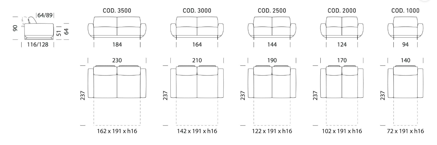 Диван доступен в пяти размерах — от 140 до 230 см; толщина матраса 16 см.