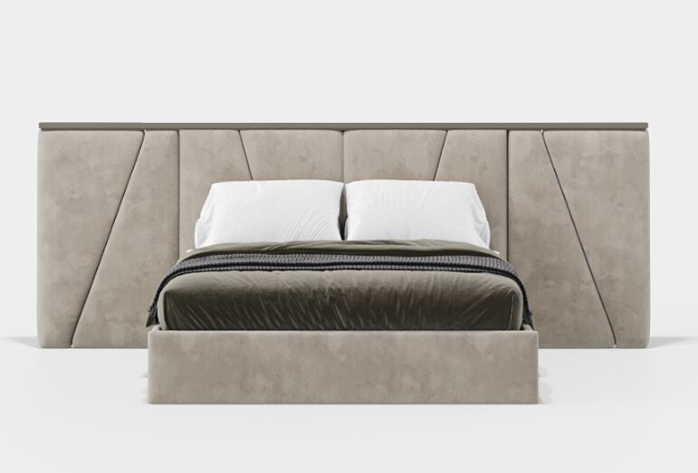 Кровать Kugha с подвесным основанием подчеркивает современную эстетику, сочетая внушительное изголовье с приподнятым основанием, которое придает пространству плавность. Тщательно распределенные вертикальные швы на изголовье кровати придают текстуру и вертикальность, в то время как подвесная конструкция смягчает объем изделия, создавая баланс между прочностью и легкостью.