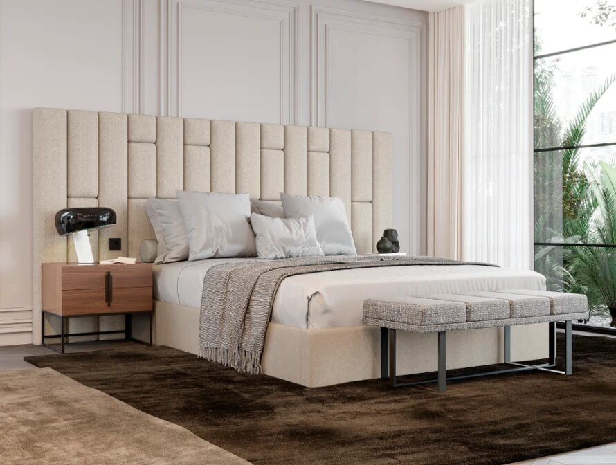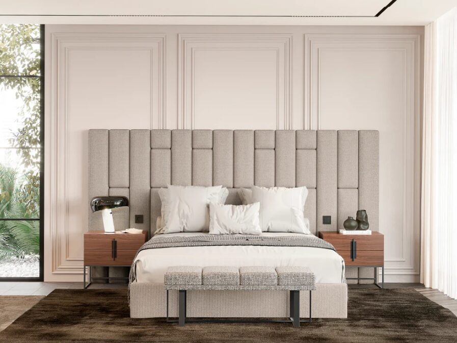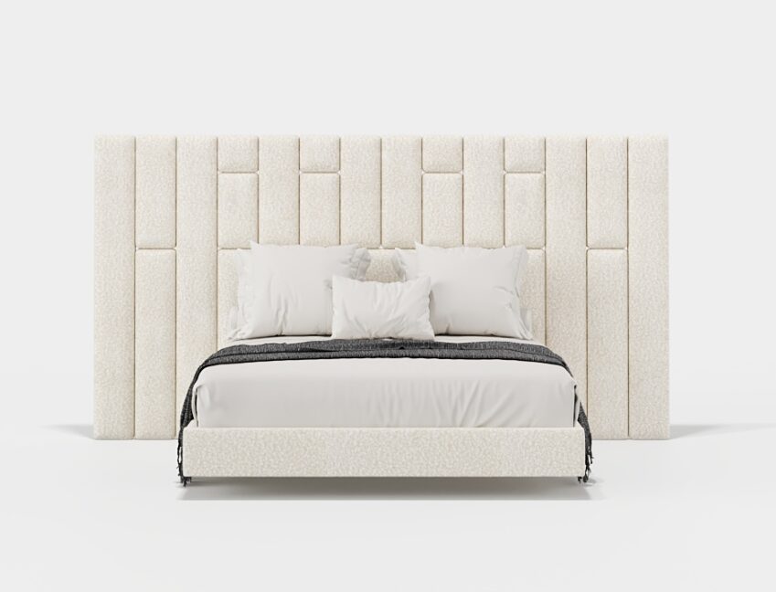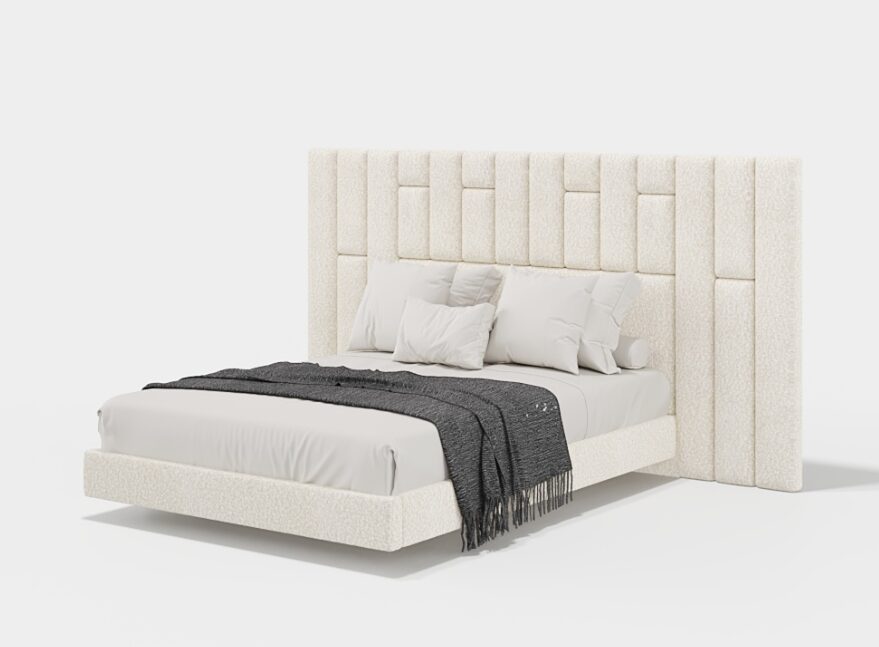 Кровать Marpa с подвесным основанием отличается четкими линиями и сбалансированными пропорциями, создавая в спальне бесшумную архитектурную атмосферу. Широкое изголовье с изящной структурой сочетается с рельефным основанием, что смягчает объем изделия и усиливает его визуальную легкость.