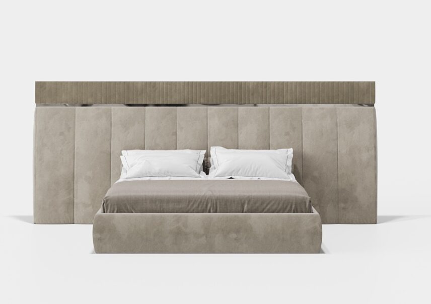 Кровать Nikay с закрытым основанием отражает баланс между формой и внешним видом. Изголовье кровати с прямыми линиями, слегка наклоненное для большего комфорта, представляет собой архитектурную и точную интерпретацию. Мягкое основание, доходящее до пола, усиливает визуальную целостность и ощущение цельности конструкции, что идеально подходит для помещений, где ценится порядок и безмятежная эстетика.