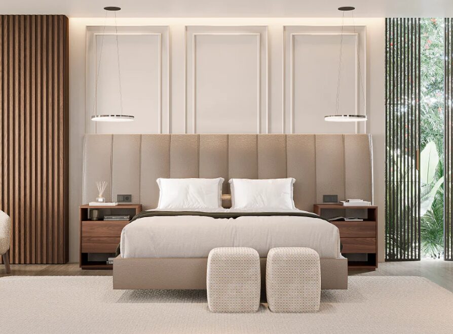 Кровать Nikay II с подвесным основанием сочетает в себе архитектурную привлекательность и визуальную легкость, подчеркивая баланс между комфортом и дизайном. Вертикальное изголовье с мягкой обивкой придает кровати устойчивость и сдержанность, а подвесное основание создает эффект подъема, который усиливает плавность обстановки.