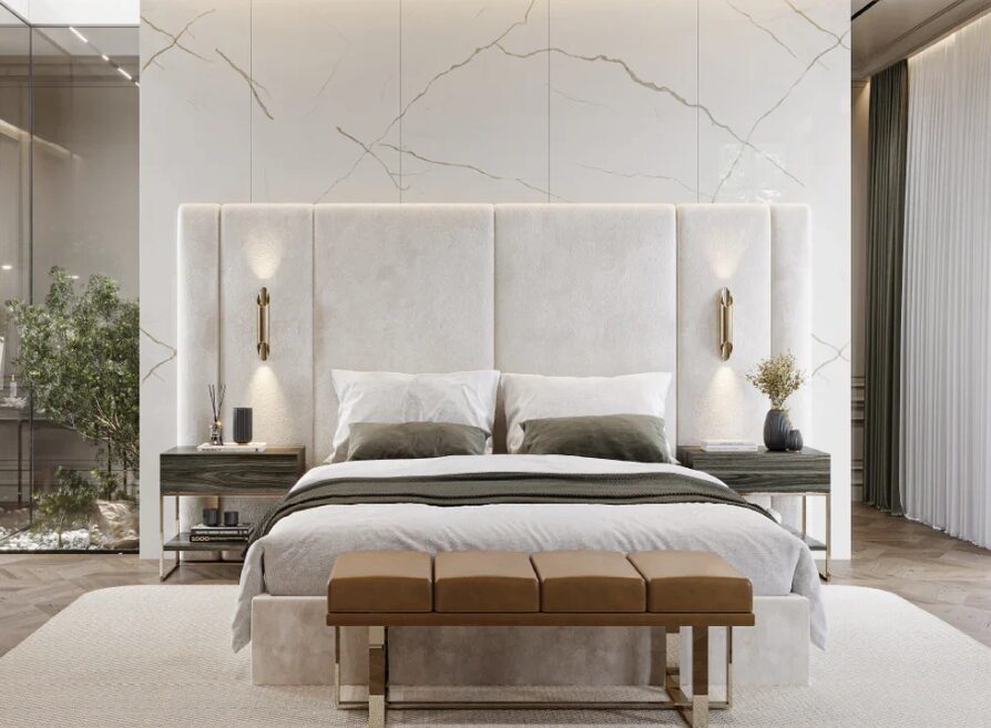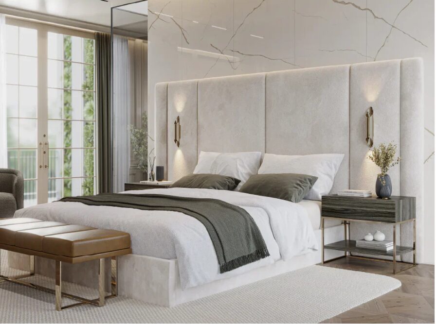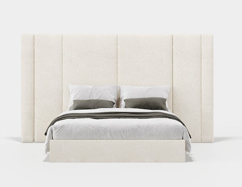 Кровать Rubi с подвесным основанием демонстрирует скульптурный подход к мебели для спальни. Широкое, ритмичное изголовье с выраженными вертикальными швами создает графичный и обволакивающий эффект. Рельефное основание придает мебели легкость, в результате чего получается визуально внушительное, но в то же время структурно плавное изделие.