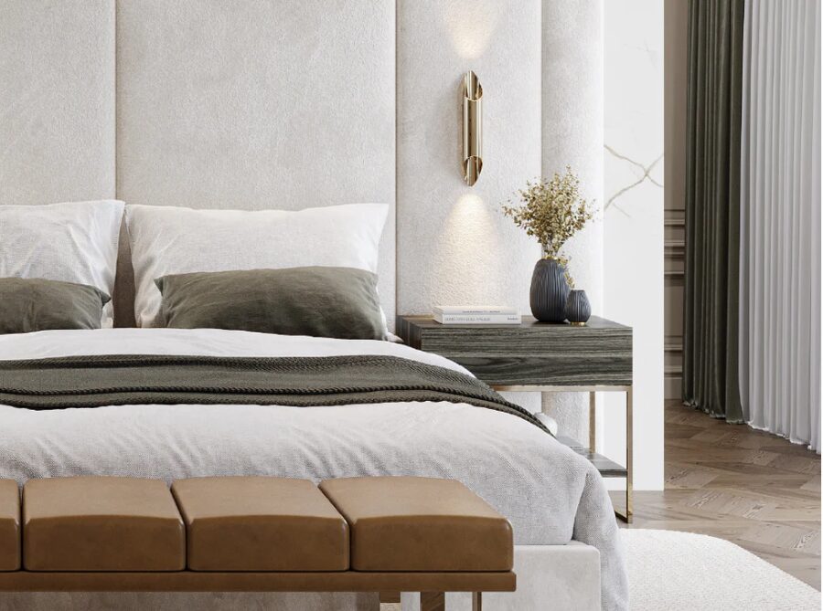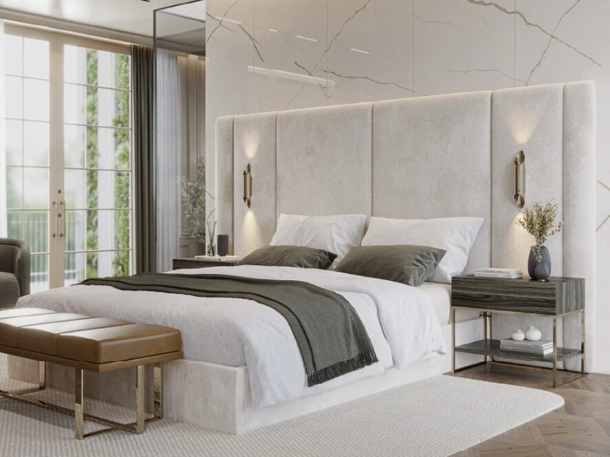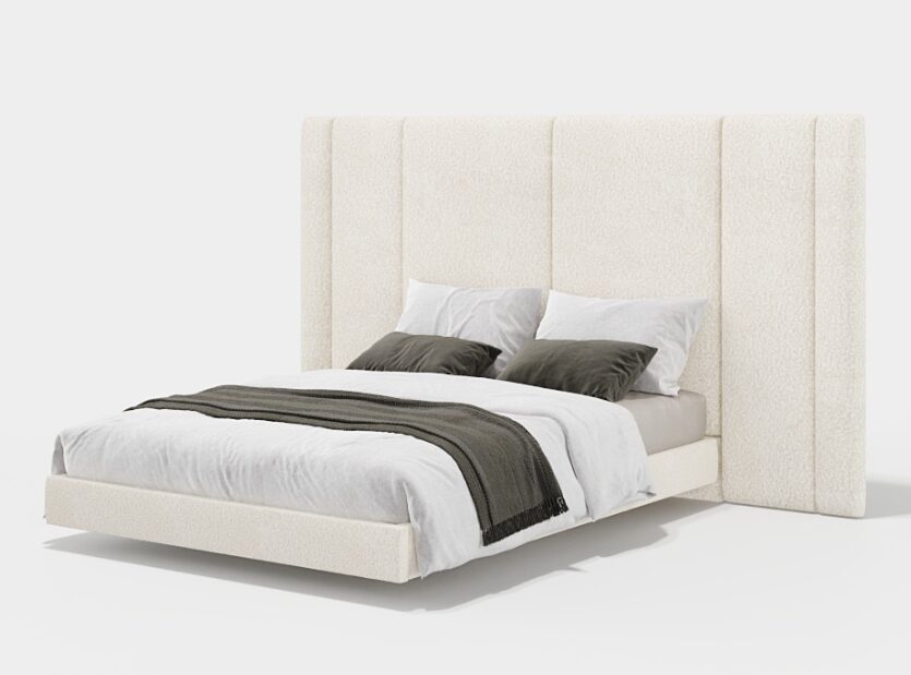 Кровать Rubi с подвесным основанием демонстрирует скульптурный подход к мебели для спальни. Широкое, ритмичное изголовье с выраженными вертикальными швами создает графичный и обволакивающий эффект. Рельефное основание придает мебели легкость, в результате чего получается визуально внушительное, но в то же время структурно плавное изделие.