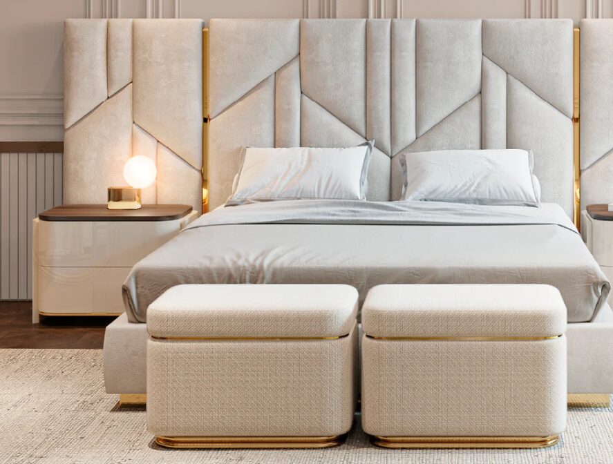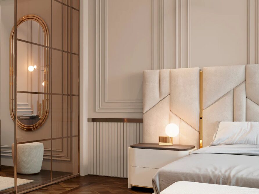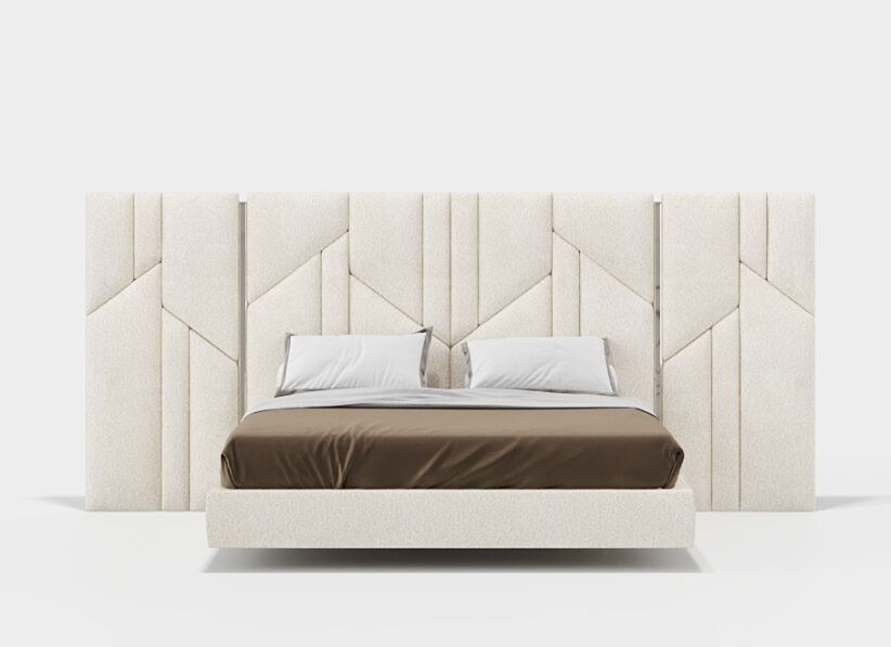 Кровать Vercelli с закрытым основанием выделяется своим вертикальным акцентом и выразительным присутствием. Изголовье кровати, состоящее из аккуратно расположенных обитых панелей, создает тонкий визуальный ритм, который структурирует пространство. Мягкое основание, доходящее до пола, продолжает силуэт изделия и усиливает его устойчивость, создавая визуально цельный и гармоничный ансамбль.