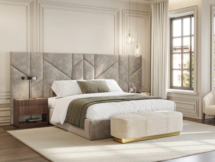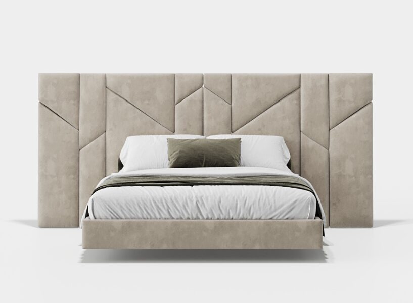 Кровать Vercelli III с подвесным основанием воплощает линейную и утонченную эстетику. Вертикальное изголовье кровати, выполненное из обитых тканью панелей с графическим рисунком, придает пространству текстуру и глубину. Приподнятое основание придает конструкции легкость и смягчает визуальное воздействие изделия, создавая идеальный баланс между формой и плавностью.