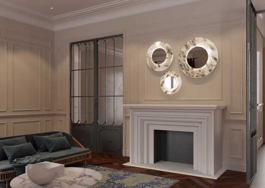 Mirror Disc — это светильник, состоящий из волнистых алебастровых дисков в сочетании с зеркалами и мраморными элементами, создающими элегантную игру света, отражений и теней. Его минималистичный дизайн ненавязчиво выделяется на фоне стен или потолков, незаметно и изысканно вписываясь в любое пространство.