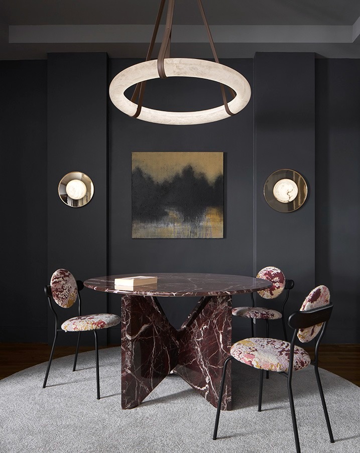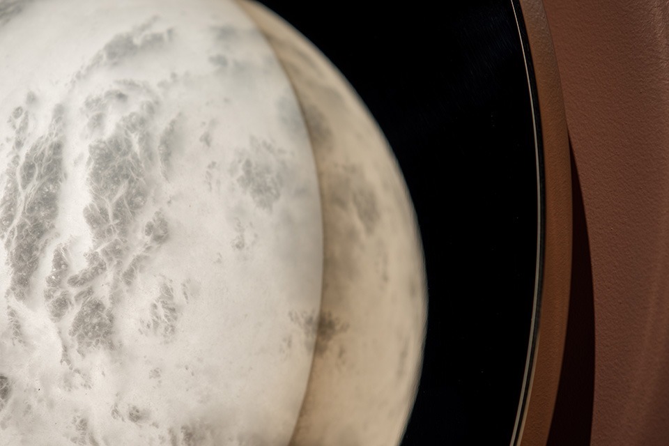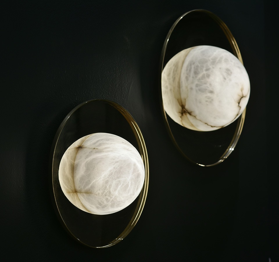Полусфера из алебастра, заключенная в светящуюся раму, сочетает в себе мягкое сияние камня и изысканный блеск полированной зеркальной латуни. Этот тонкий контраст создает потрясающую игру света и отражений, придавая помещениям скульптурную элегантность и вневременное присутствие.