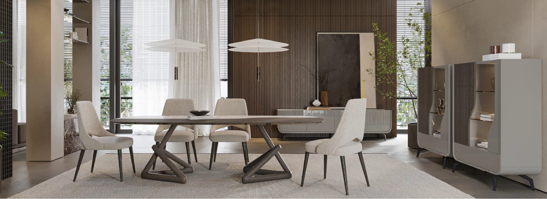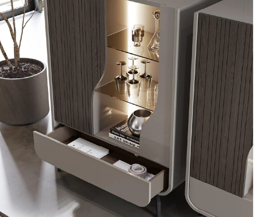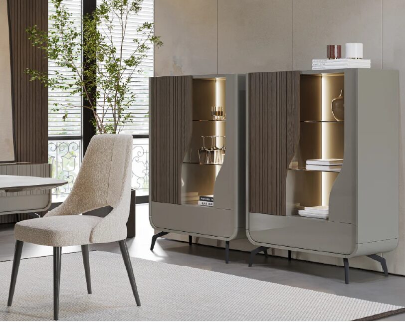 Витрина Linard на ножках сочетает в себе современную эстетику и функциональность, становясь центральным элементом столовой. Благодаря ножкам, которые обеспечивают визуальную легкость, она выделяется сочетанием лаков и дерева, создавая эксклюзивные и изысканные композиции.