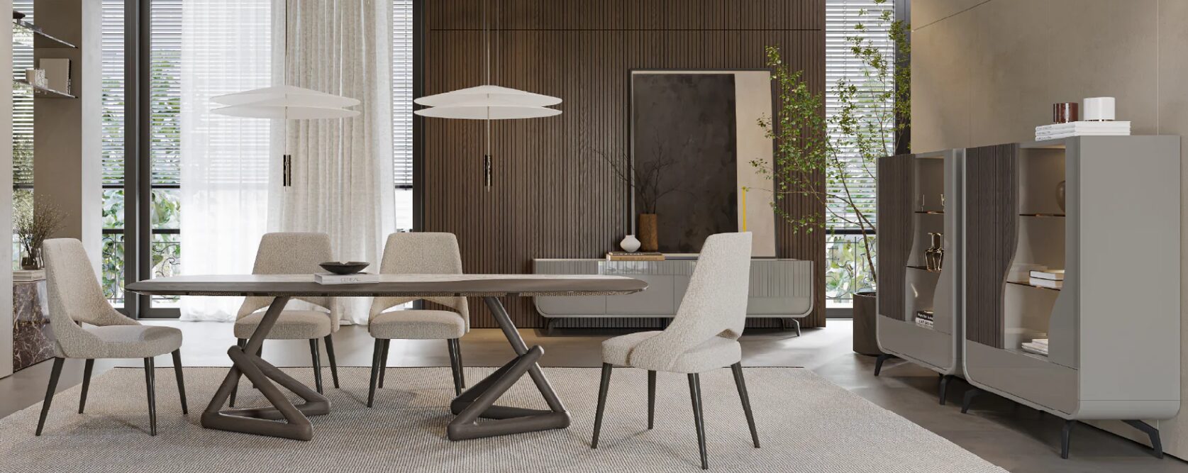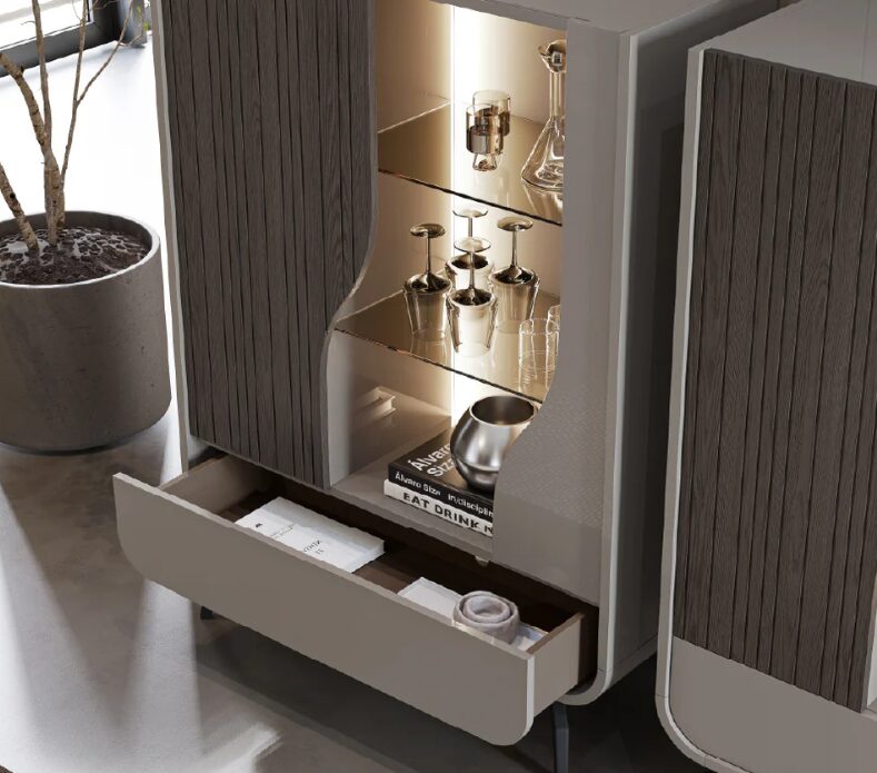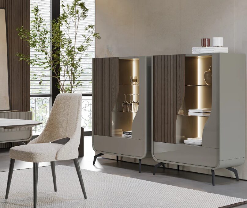 Шкаф-витрина Linard с плинтусом сочетает в себе надежность и современную эстетику, становясь центральным элементом в столовой. Цельнокроеный плинтус обеспечивает устойчивость, а сочетание лаков и древесины придает композиции эксклюзивность и изысканность.