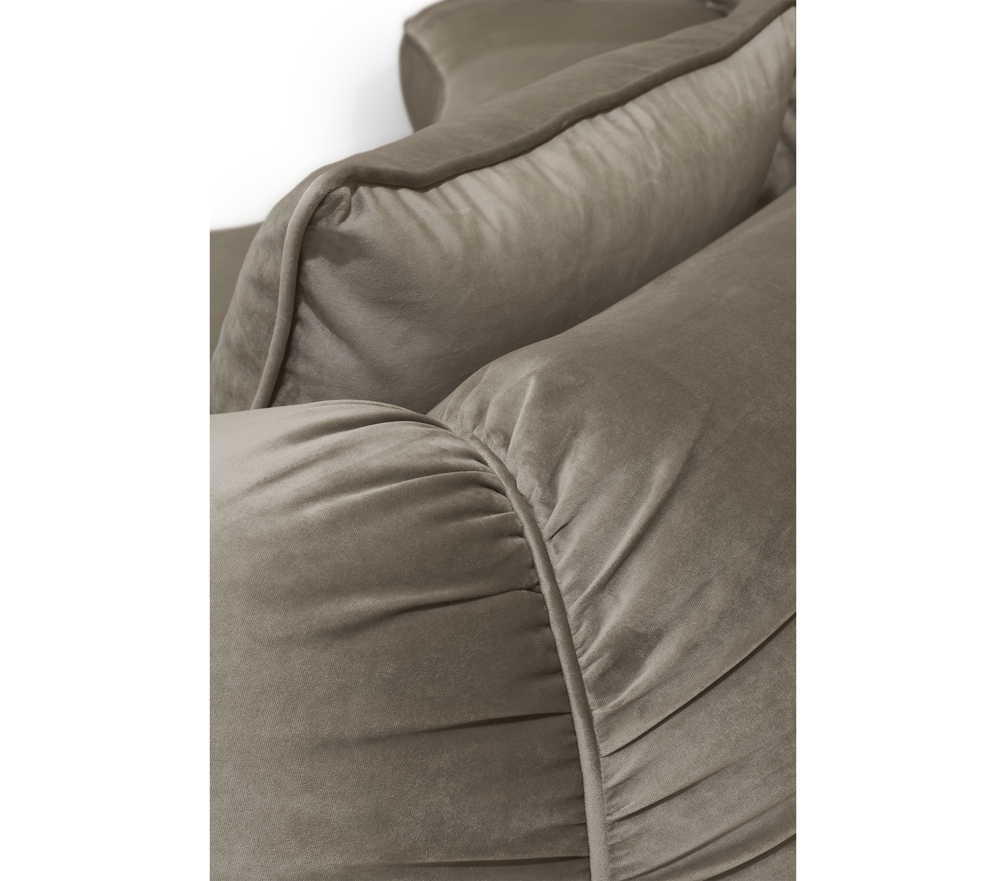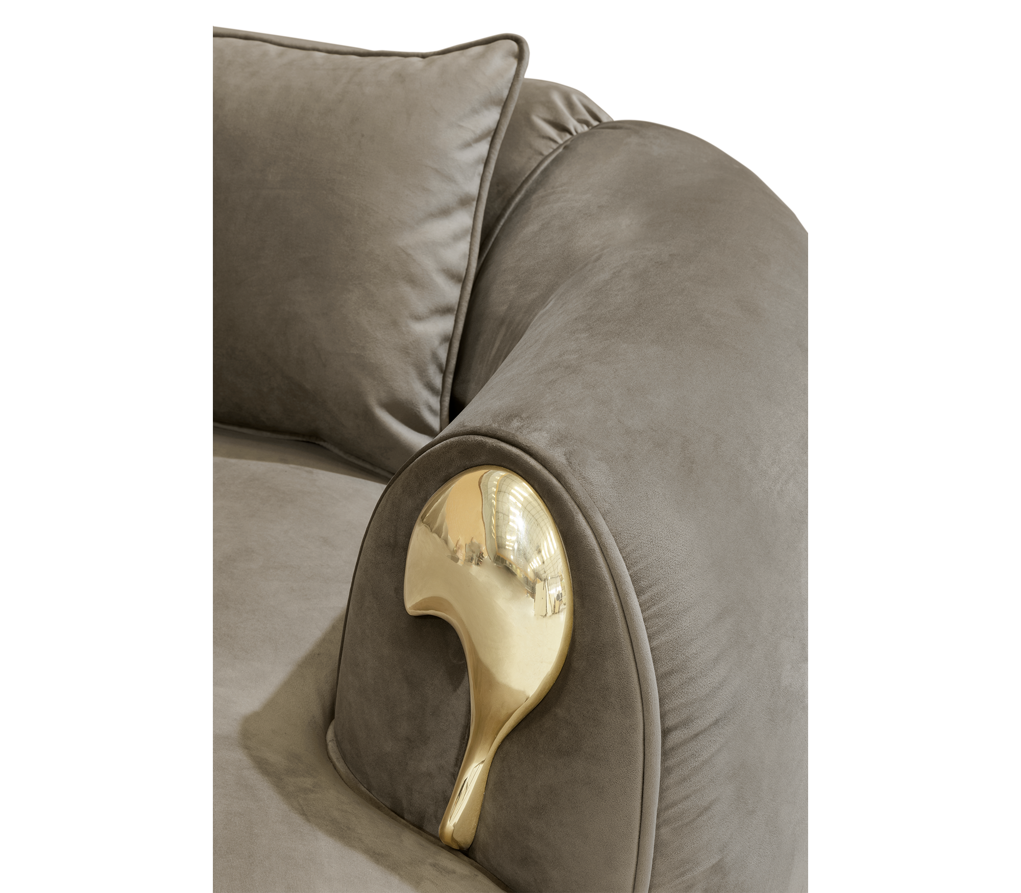 Модель с кремовой обивкой и латунными деталями отличается игривыми линиями, сохраняя при этом изысканность. Двухсекционная конструкция (330×162×72 см) обеспечивает комфорт и функциональность, гармонично вписываясь в просторные помещения. Произведено в Португалии с безупречным вниманием к деталям.
