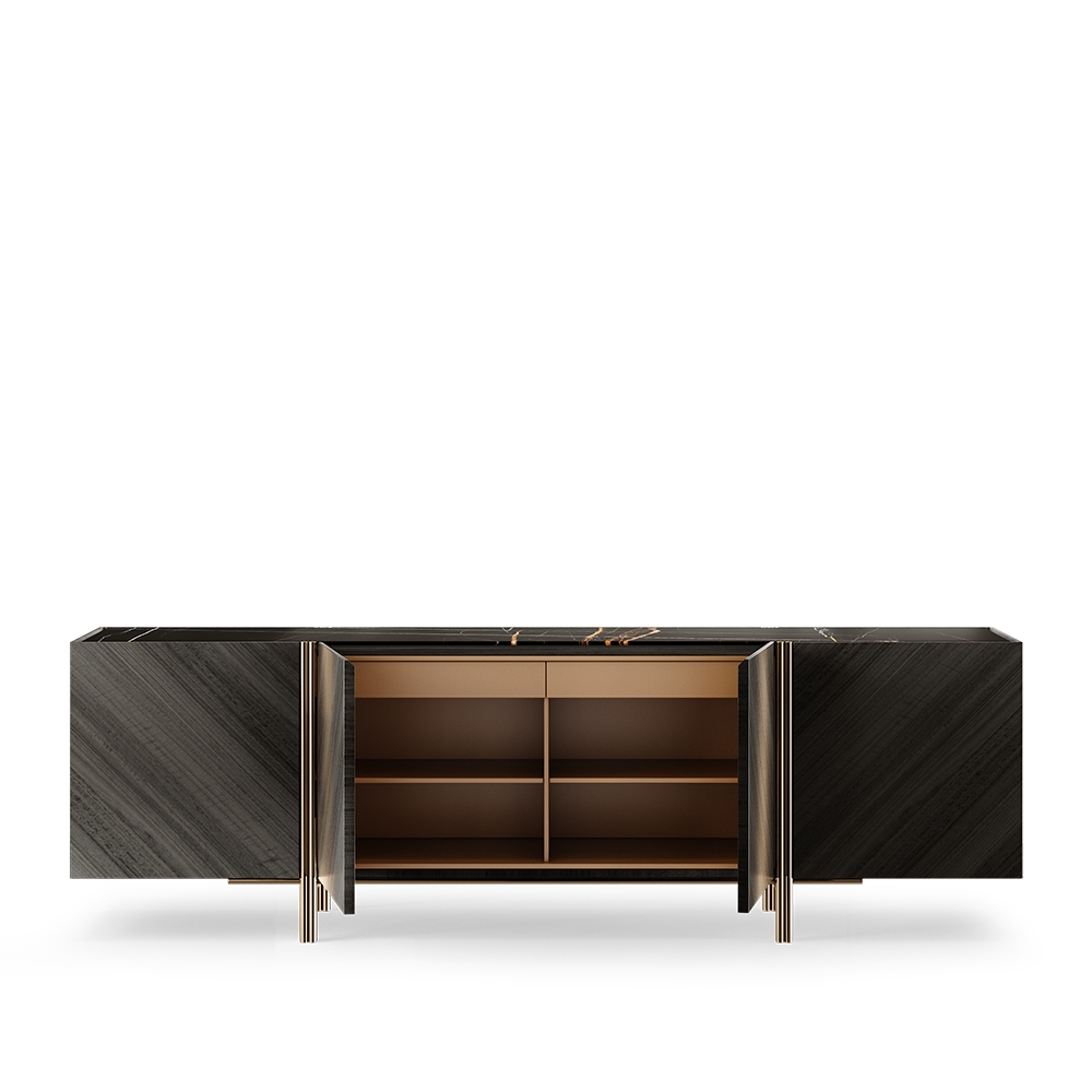 Дизайнерский комод EDGE от португальской фабрики PRIVATE LABEL — воплощение современной эстетики и безупречного качества. Изящные линии, сочетание матовой латуни, темного эвкалиптового шпона, лакированного дерева и мрамора Sahara Noir создают эффектный контраст. Внутренняя отделка из лакированного дерева подчеркивает внимание к деталям.