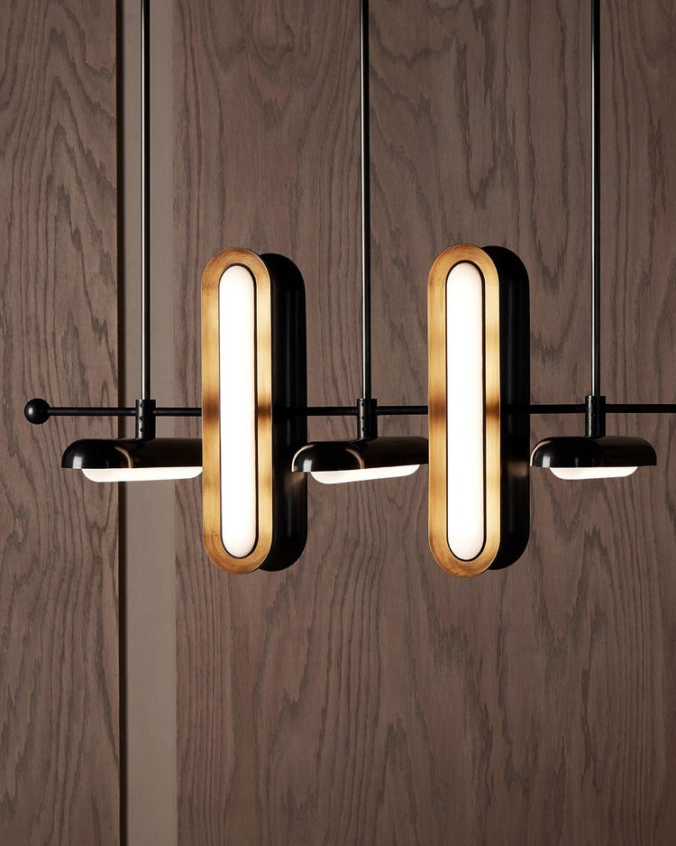 СЕРИЯ CIRCUIT СОЗДАЕТ РИТМ, ПОВТОРЯЯ ЧИСТЫЕ ФОРМЫ. СВЕТЯЩАЯСЯ СТЕКЛЯННАЯ КАПСУЛА, ОБРАМЛЕННАЯ ЛАТУННЫМ АБАЖУРОМ, СТАНОВИТСЯ ЗАМКНУТОЙ ФОРМОЙ, КОТОРАЯ РАСШИРЯЕТСЯ ДЛЯ СОЗДАНИЯ БОЛЕЕ КРУПНЫХ СВЕТИЛЬНИКОВ.