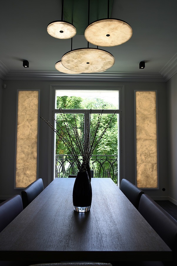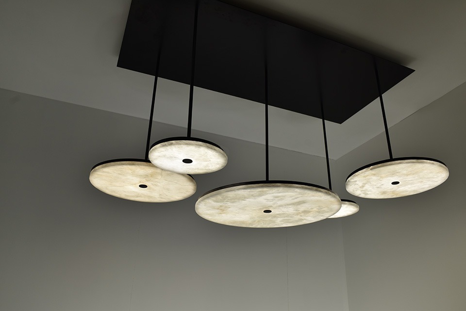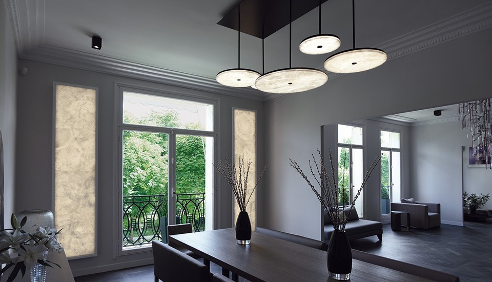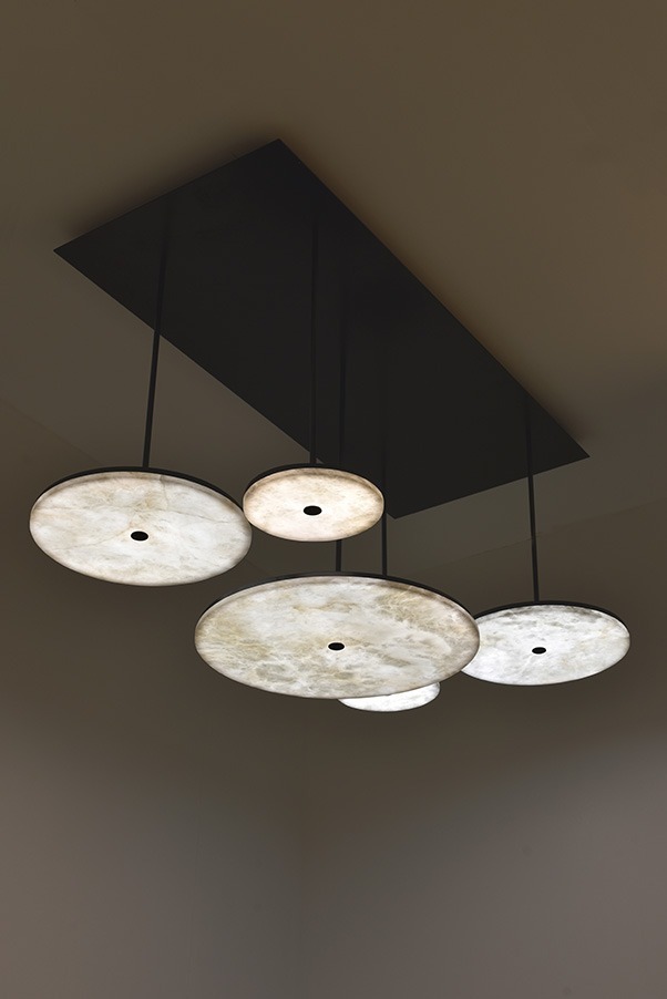 МАНХЭТТЕН выпускает горизонтальные алебастровые диски разного диаметра, которые часто собираются в грандиозные композиции. Эта подвесная конструкция увеличивает объем и освещенность, предлагая бесступенчато регулируемое свечение, которое создает утонченную и захватывающую атмосферу.