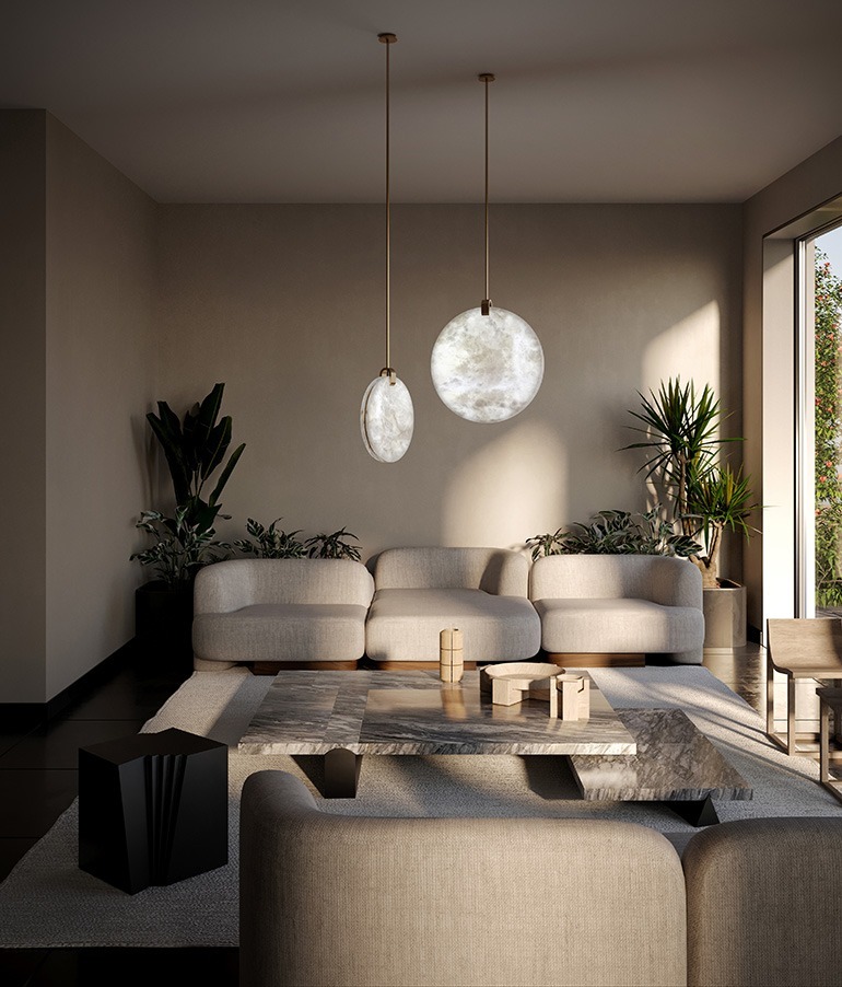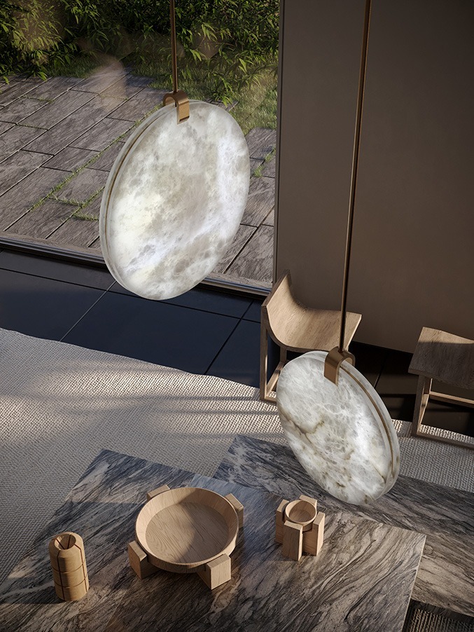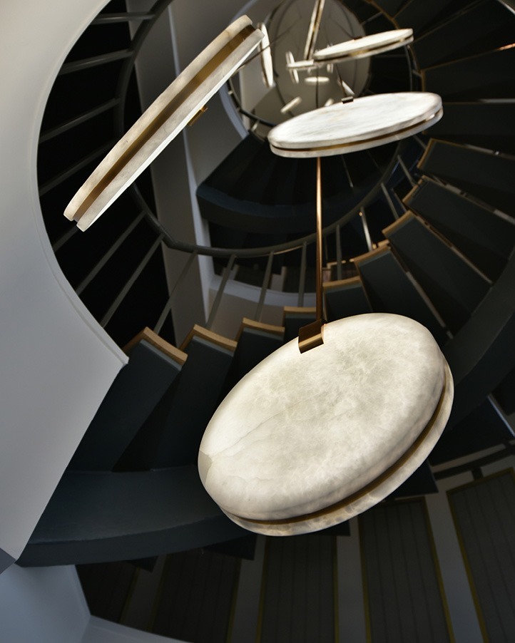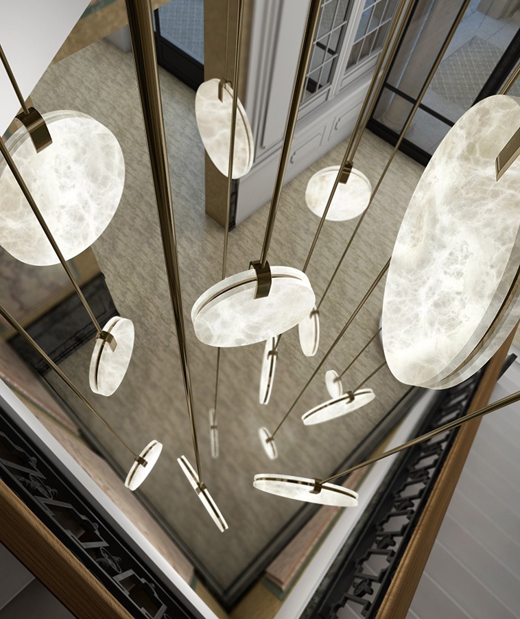 SOHO воплощает в себе идеальный баланс симметрии, благодаря двум подвесным алебастровым дискам, соединенным незаметным металлическим кольцом. Эта подвеска сочетает в себе гармонию и оригинальность, предлагая изысканный и в то же время смелый дизайн, который позволяет создавать интимные или эффектные композиции с подписью Алена Эллуза Париса.