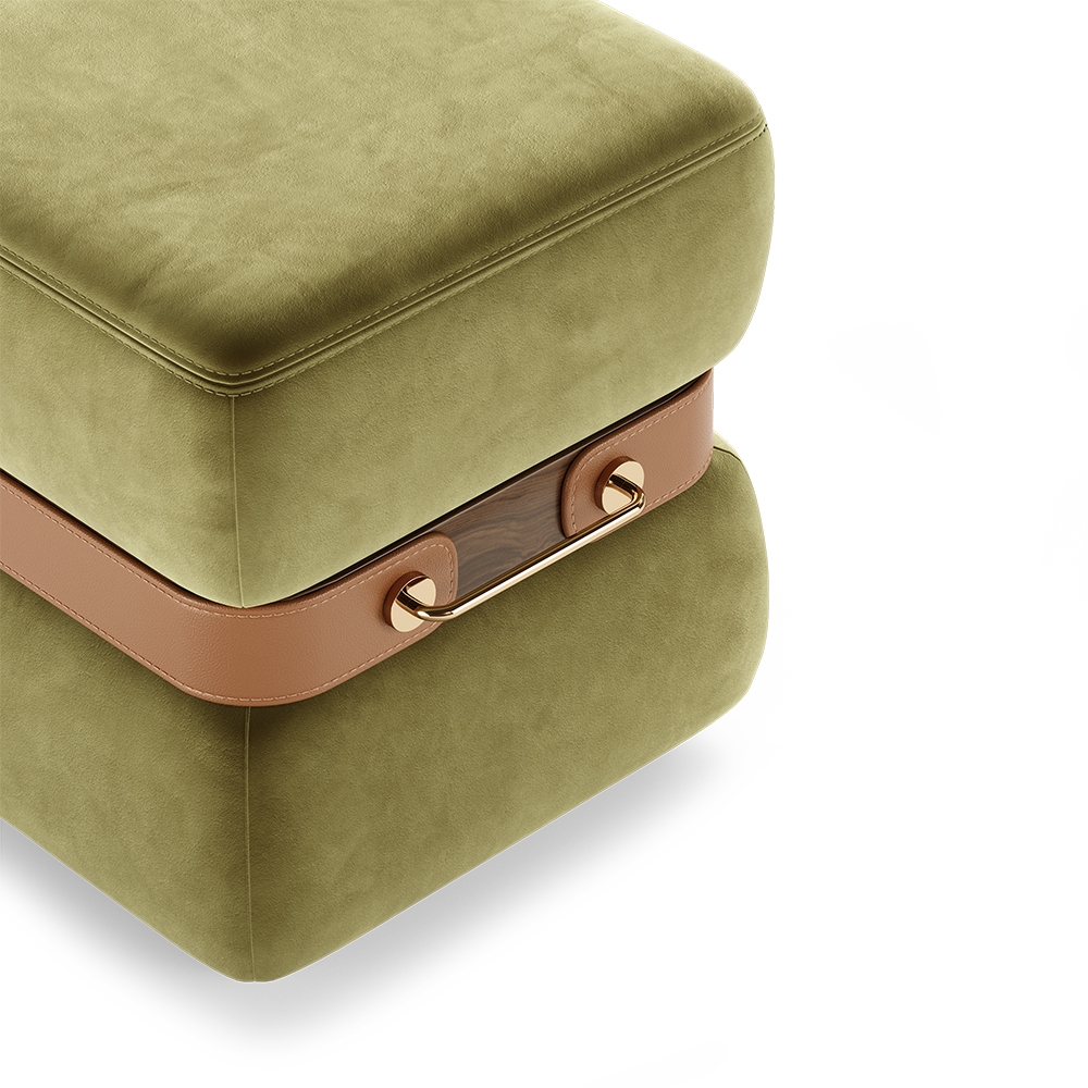 Пуф RAY привлекает внимание ретро-силуэтом, который идеально вписывается как в классические, так и в современные интерьеры. Кожаный ремень, обрамляющий корпус, добавляет смелый акцент, подчеркивая изысканность линий. Этот элемент не только декоративный, но и функциональный, создавая визуальную легкость и завершенность композиции.