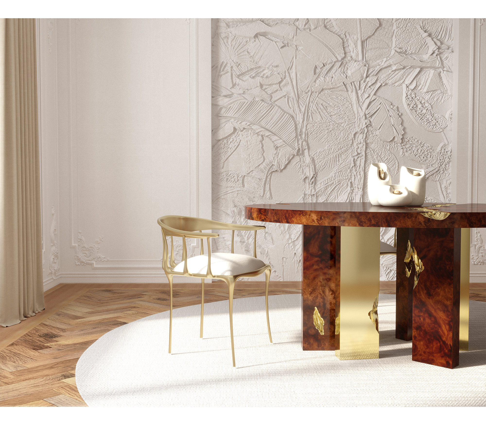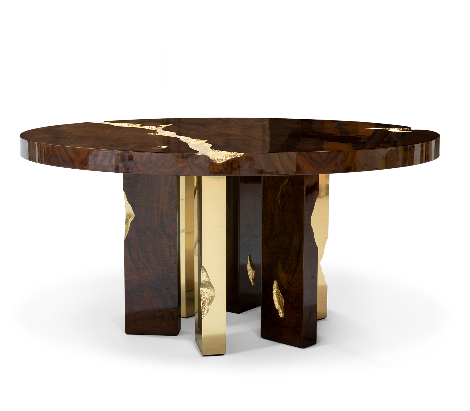 Дизайнерский обеденный стол Empire Round от легендарной португальской фабрики BOCA DO LOBO — воплощение роскоши и власти. Стол в стиле Ампир с трещинами, открывающими золотую отделку, символизирует силу и стремление к процветанию. Идеально подходит для тех, кто ценит исключительный дизайн и историческую эстетику.
