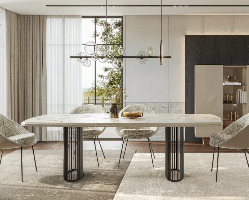 Выдвижной обеденный стол Lazzari сочетает в себе пропорции и функциональность с внушительным, но сдержанным внешним видом. Геометрический дизайн и скульптурное основание придают ему характер, а выдвижная система обеспечивает гибкость для различных общественных мероприятий.