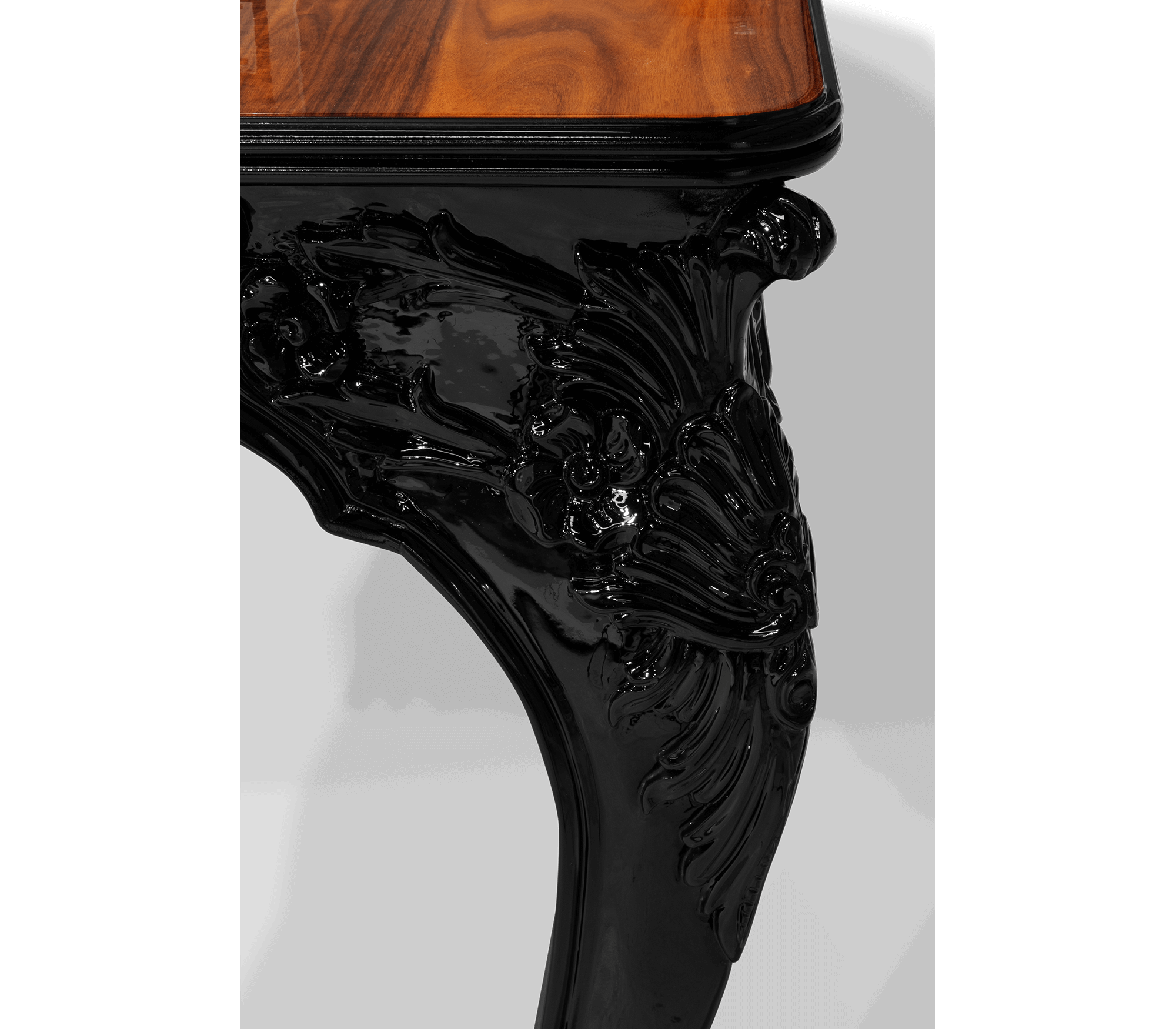 Стол Royal — это гармоничное сочетание пышности барокко и современной лаконичности. Его изогнутые линии и резные элементы, выполненные вручную, создают эффект динамики, а столешница, украшенная шпоном палисандра, напоминает живописное полотно. Каждый уголок этого стола продуман до мелочей, отражая философию бренда: «Преображать пространство через искусство».
