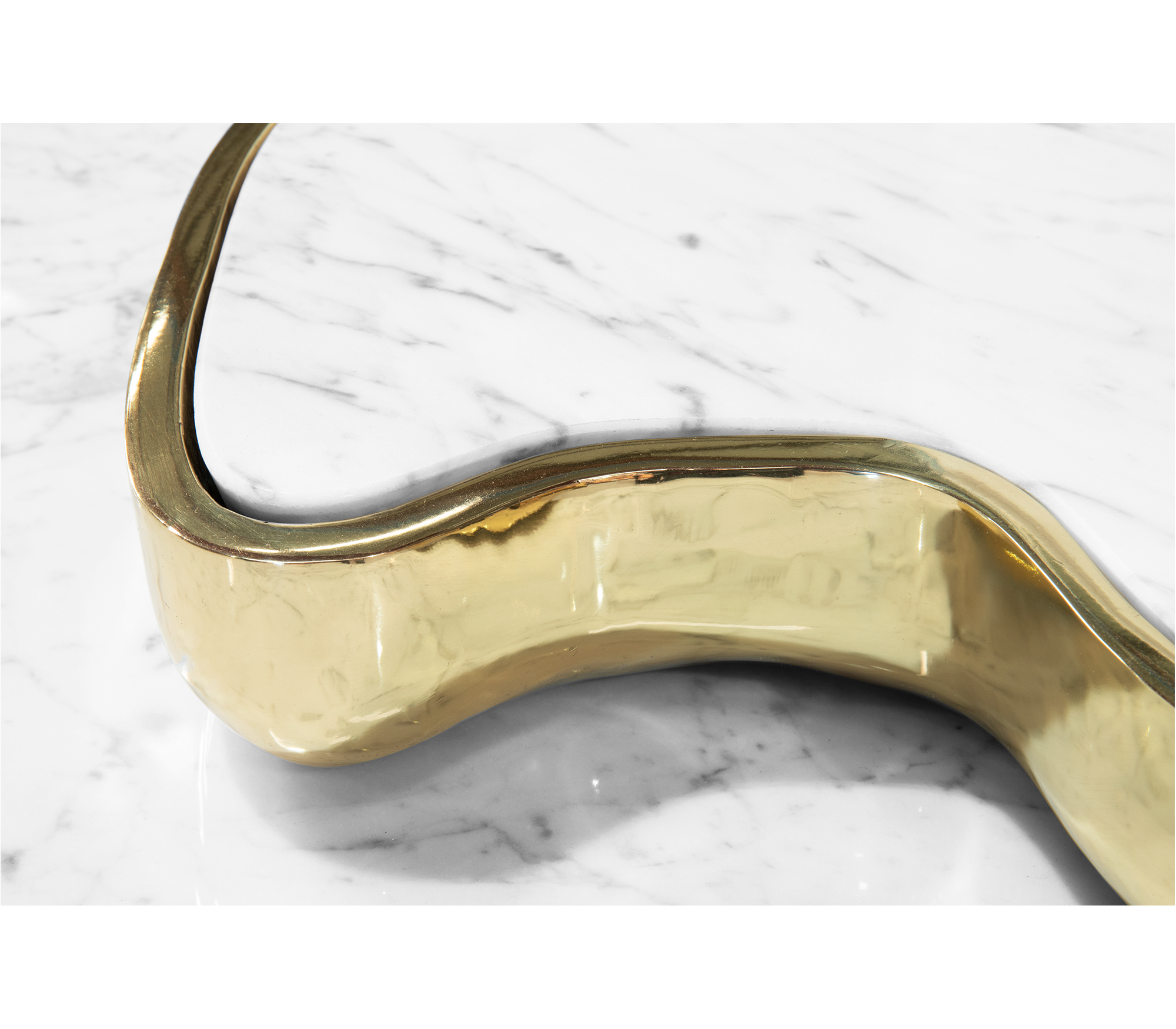 Столик Navarra — это современная интерпретация классики, где каждая деталь продумана до мелочей. Два квадратных модуля из благородного мрамора соединены органичной столешницей, покрытой литой латунью. Такое решение создает эффект динамики и глубины, превращая обычный предмет мебели в арт-объект. Насыщенный цветовой фон с выразительными прожилками притягивает взгляд, а латунная окантовка добавляет нотку благородного блеска.