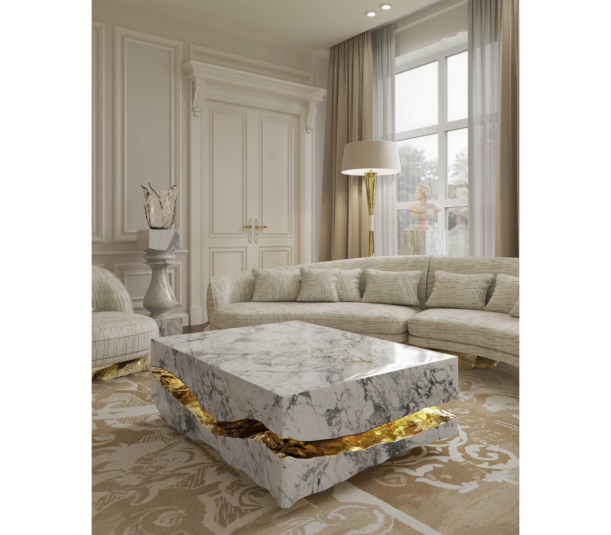 Дизайнерский столик Quarry от BOCA DO LOBO (Португалия) — воплощение роскоши и природной эстетики. Изготовлен из каррарского мрамора с уникальными прожилками, подчеркивающими его эксклюзивность. Полированная латунная рама добавляет благородный блеск, создавая гармоничный контраст с натуральным камнем.
