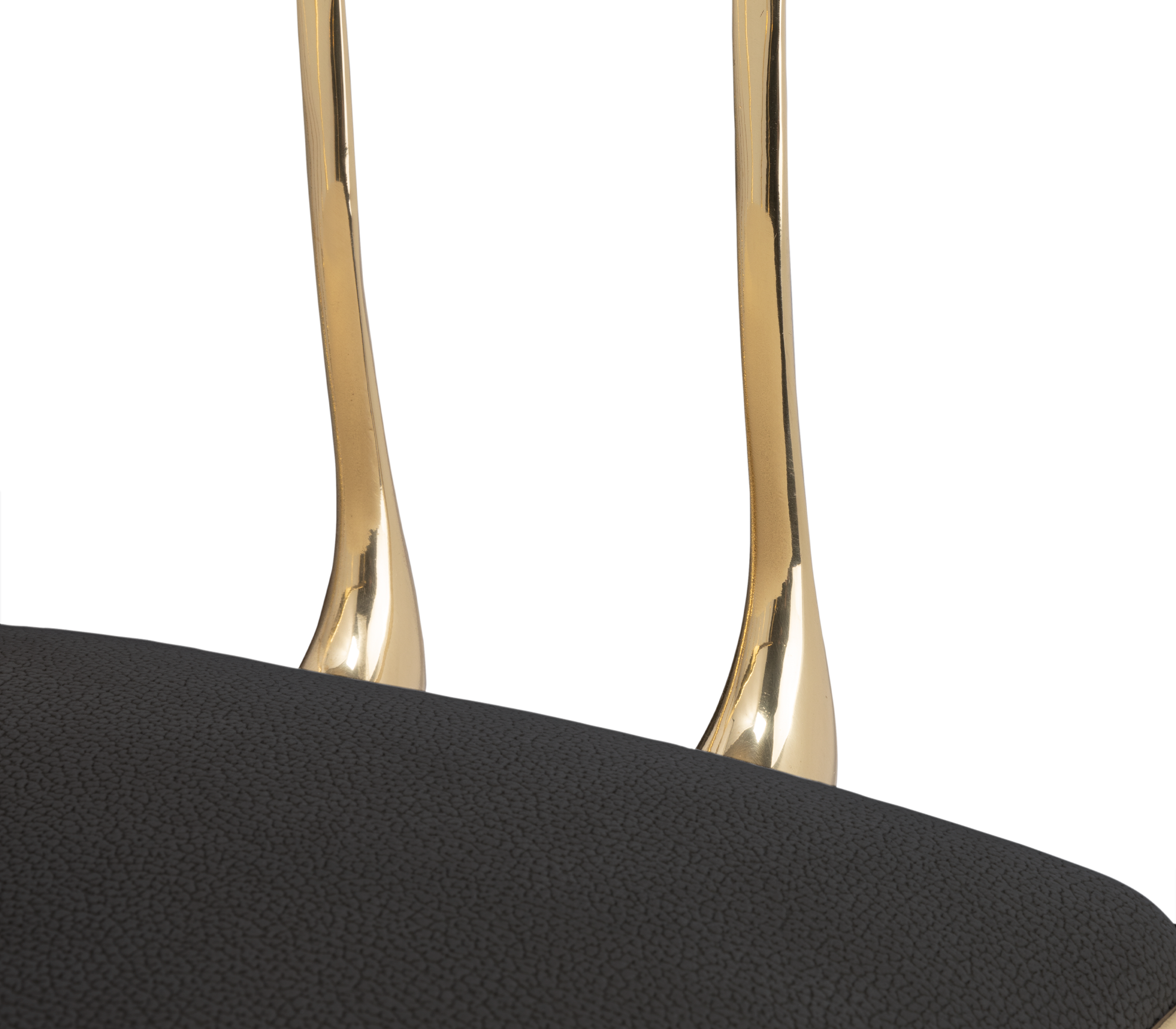 Изготовлен из цельнолитой латуни с позолотой и лаковым покрытием, он создает эффект «нарушения» законов физики благодаря изогнутым линиям спинки и ножек. Сиденье обито мягким бархатом, доступно в различных цветовых решениях. Идеальный акцент для премиальных интерьеров гостиных или столовых.