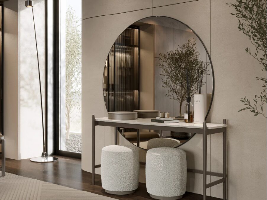 Туалетный столик Colline с шкатулкой для драгоценностей благодаря спокойному и продуманному дизайну располагает к созерцанию. Его простые формы, изысканная столешница и продуманная система хранения отражают современное видение предметов первой необходимости. Это идеальное изделие для спален и гардеробных, где личная гигиена соответствует эстетике помещения.