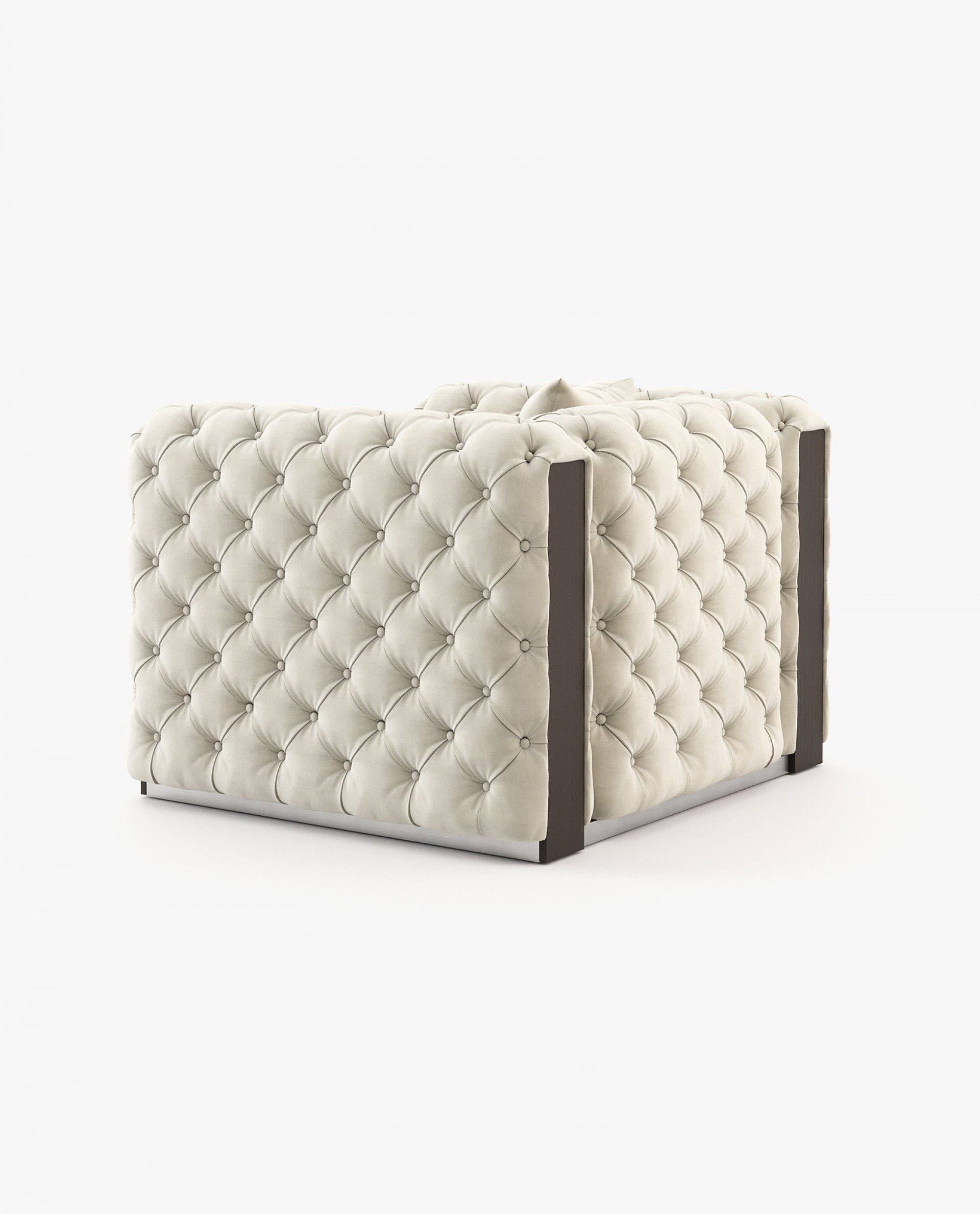 Кресло Jean сочетает в себе чистые линии и скульптурную выразительность. Его главная особенность — спинка, выполненная в технике глубокого застегивания, которая создает эффект объемного рельефа. Такое решение не только добавляет визуальной глубины, но и обеспечивает идеальную поддержку спины. Деревянные акценты и металлическое основание придают модели сбалансированную легкость, делая ее универсальной для интерьеров в стиле модерн, ар-деко или неоклассика.