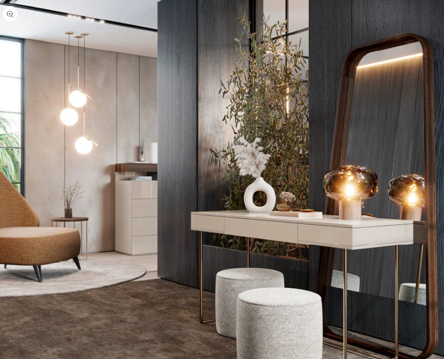 Зеркало Dharmi отличается современным дизайном и минималистичными линиями и идеально подходит для прихожих, гостиных или спален, которые ценят чистый и изысканный декор. Тонкая и сдержанная рама придает помещению легкость и элегантность.