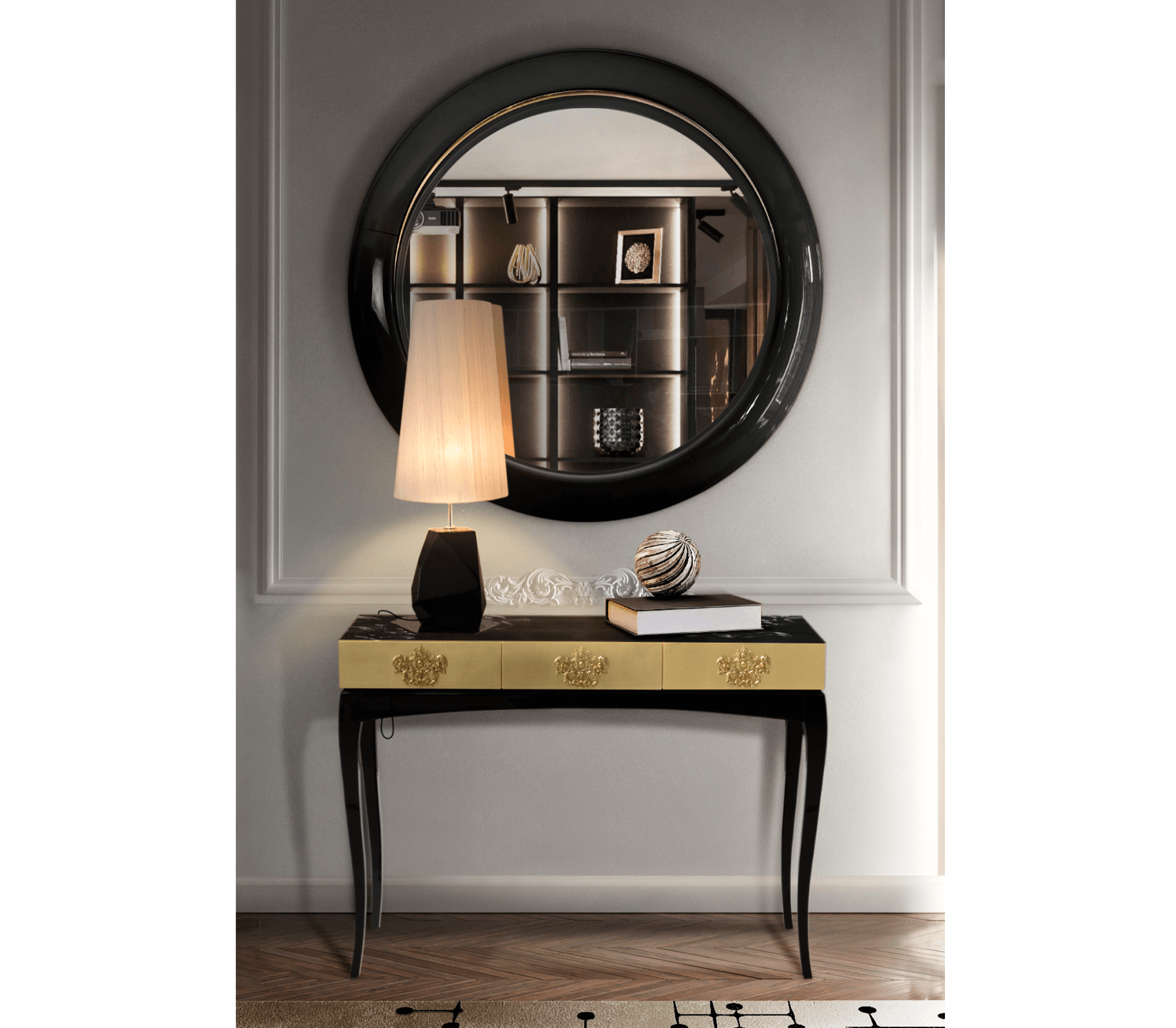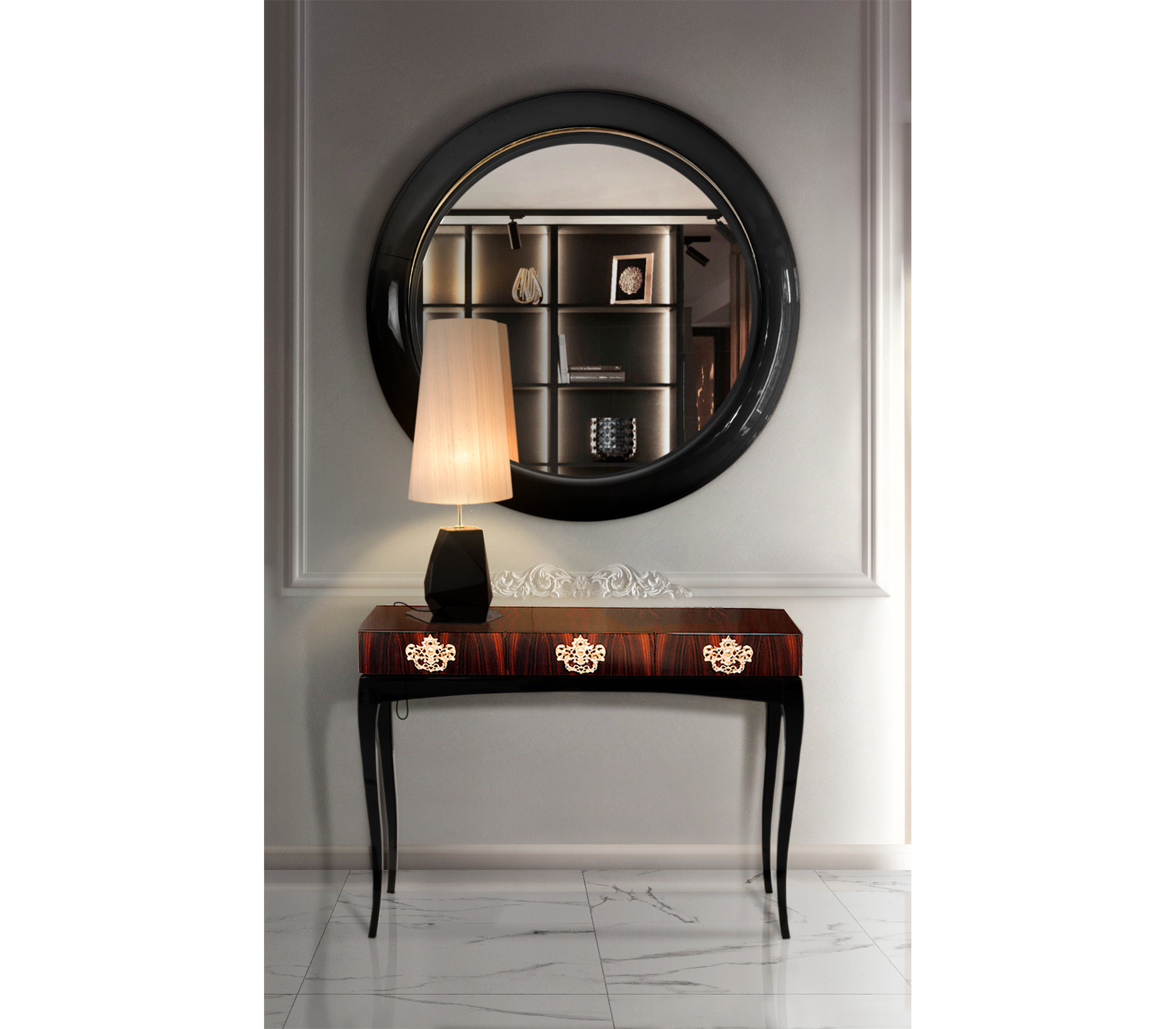 Дизайнерское зеркало Ring Round от португальской фабрики BOCA DO LOBO — это эксклюзивное произведение искусства, созданное для ценителей роскоши. Зеркало диаметром 120 см заключено в элегантную раму из черного глянцевого лака с резьбой ручной работы, подчеркивающей его уникальность. Внутренняя часть украшена изысканной деревянной инкрустацией, придающей интерьеру благородство и стиль.