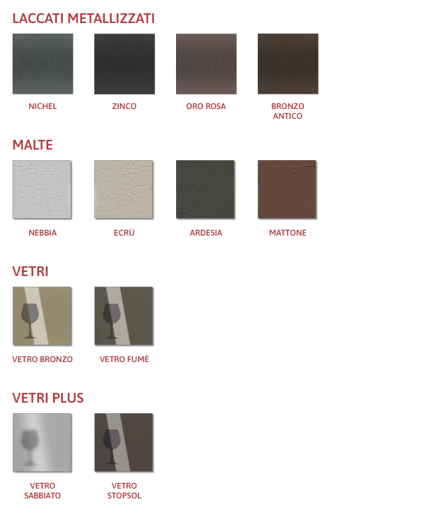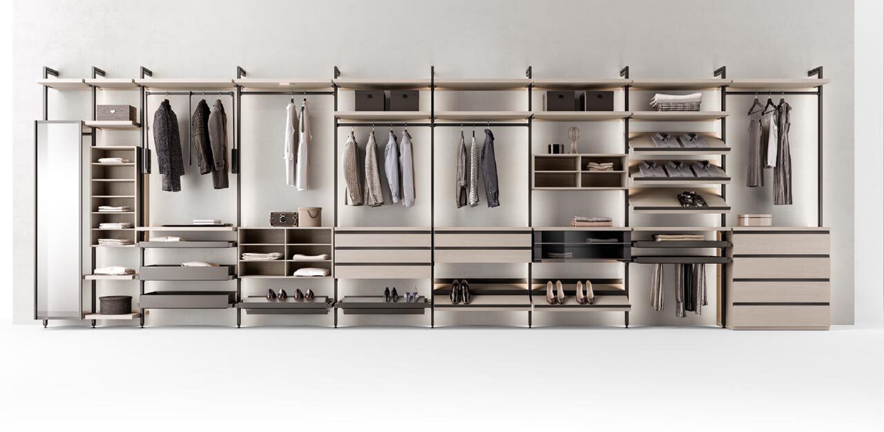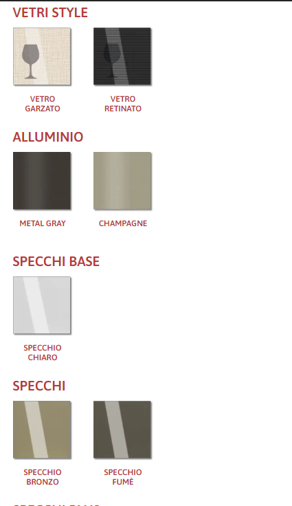 Дополнительные опции включают стеклянные и зеркальные элементы (Fumé, Bronzo, Sabbiato), что позволяет создать индивидуальный дизайн. Итальянское качество и внимание к деталям делают эту модель идеальным решением для организации пространства.