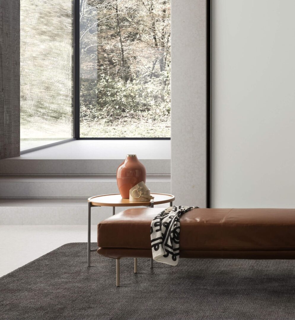 Скамья с обивкой из древесностружечных плит, обтянутая несъемной тканью, искусственной кожей или кожзаменителем. Доступна в широком ассортименте цветов. Скамья также оснащена поролоновой подушкой и соединенным клапаном, который может быть обтянут тканью, кожей или кожзаменителем со съемными чехлами. Основание, состоящее из круглых металлических ножек, изготовленных по стандарту Metal.