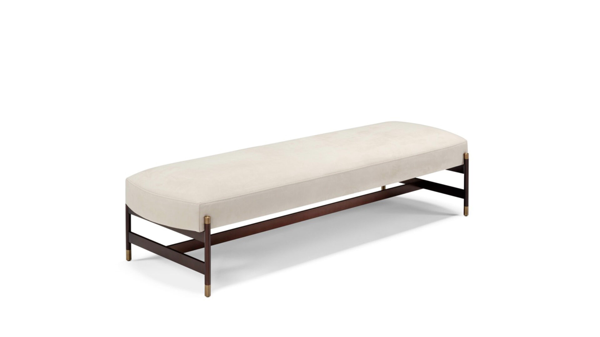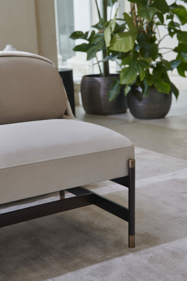 Железная скамья имеет металлическую конструкцию цвета антрацита с деталями из бронзовой латуни, на которую опирается мягкая подушка, обитая кожей или тканью.