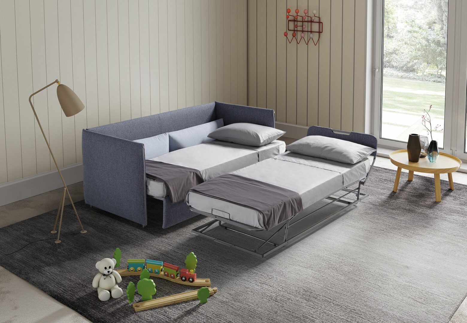 Одна кровать — сто идей. Суперуниверсальная система, которая дает каждому возможность выбрать идеальную кровать: для детской или гостевой комнаты, для центральной стены или для угла, с ящиками для хранения, второй выдвижной кроватью или ящиками из березы. Zip — это 100% кровать Novaluna: качество «Сделано в Италии», надежность тех, кто производит свою продукцию самостоятельно, и мастерство исполнения таких деталей, как дополнительная обивка спинки или застежка-молния на боковых панелях.