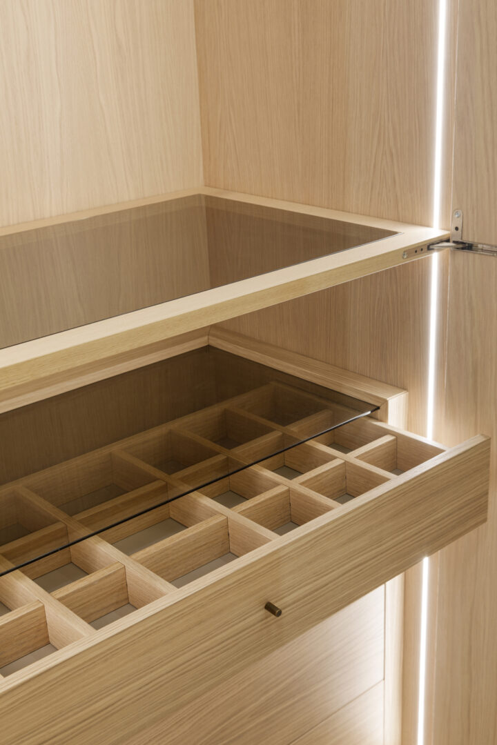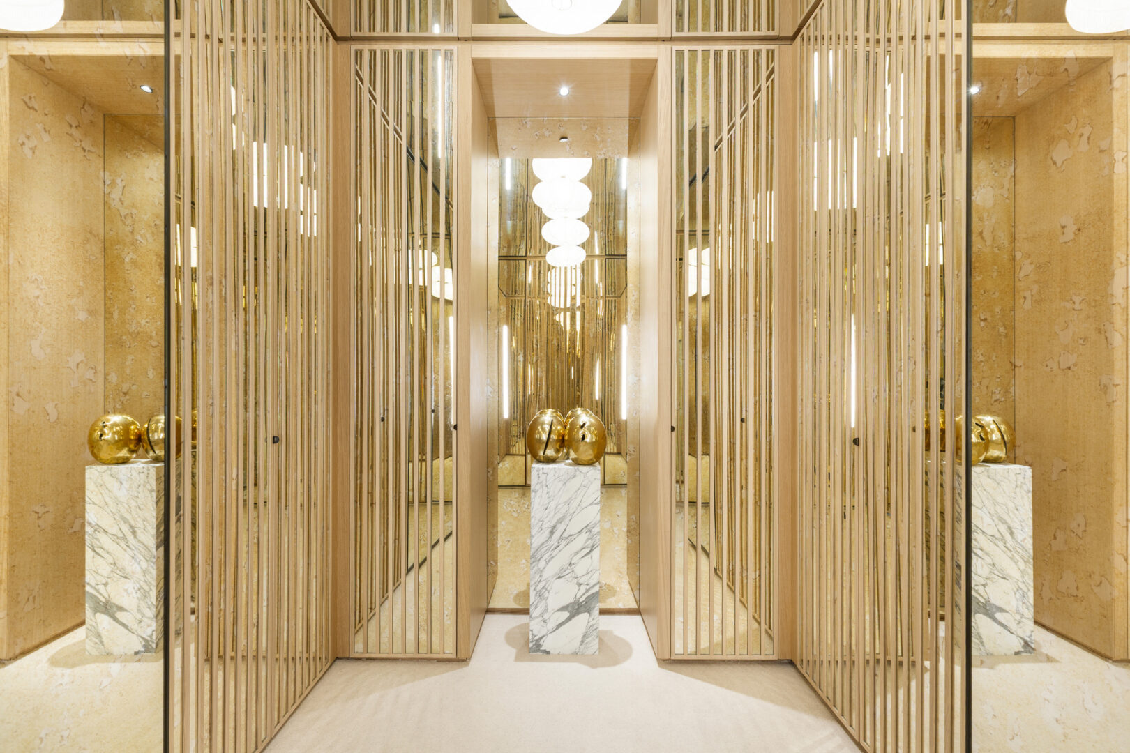 Дверная система ATRIUM – Дверная система ATRIUM представляет собой коллекцию модульных дверей для гардеробов, изготовленных из рифленого дерева и украшенных вставками из зеркального стекла под старину с позолотой. Дизайн напоминает концепцию атриума, где оптические эффекты занимают центральное место, создавая динамичный и захватывающий визуальный эффект. Благодаря своей настраиваемой природе система может быть адаптирована к потребностям и стилю окружающей среды.