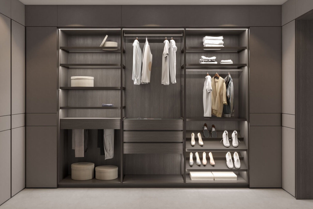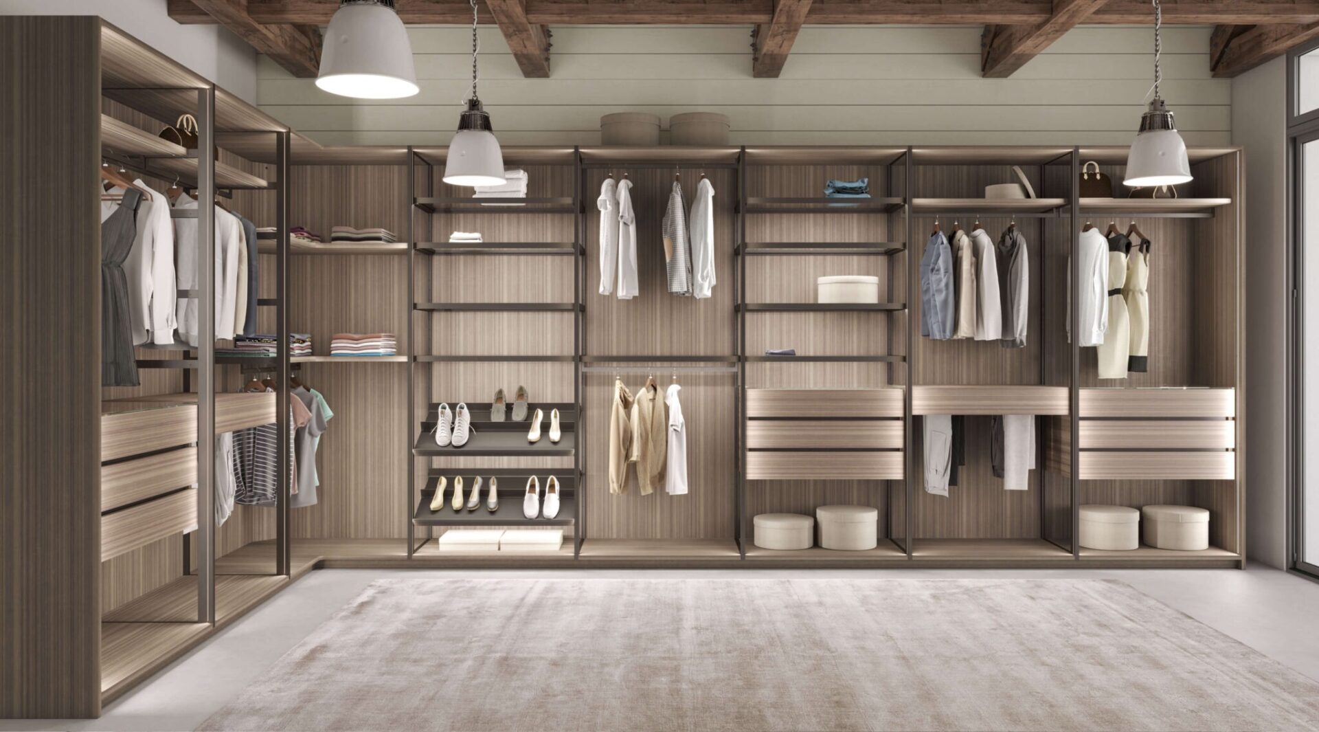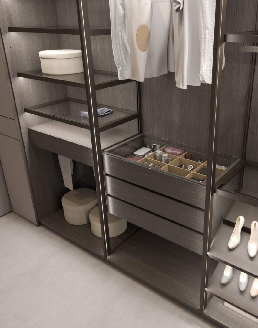 Современная, легко настраиваемая гардеробная, которую можно комбинировать с различными шкафами-купе с распашными дверцами для защиты аксессуаров и одежды. Широкий выбор фурнитуры обеспечивает функциональность, практичность и стиль.