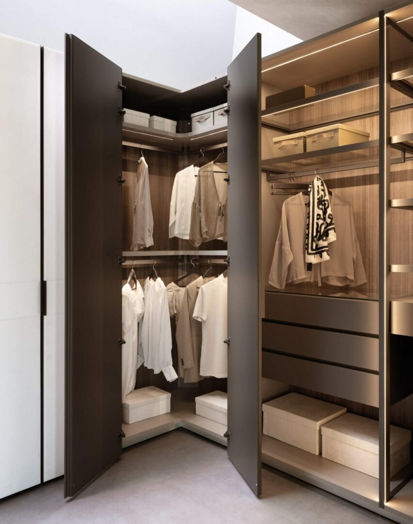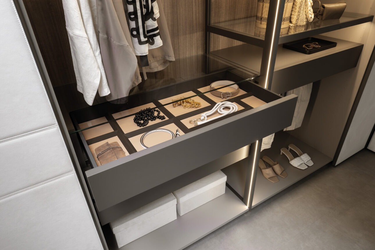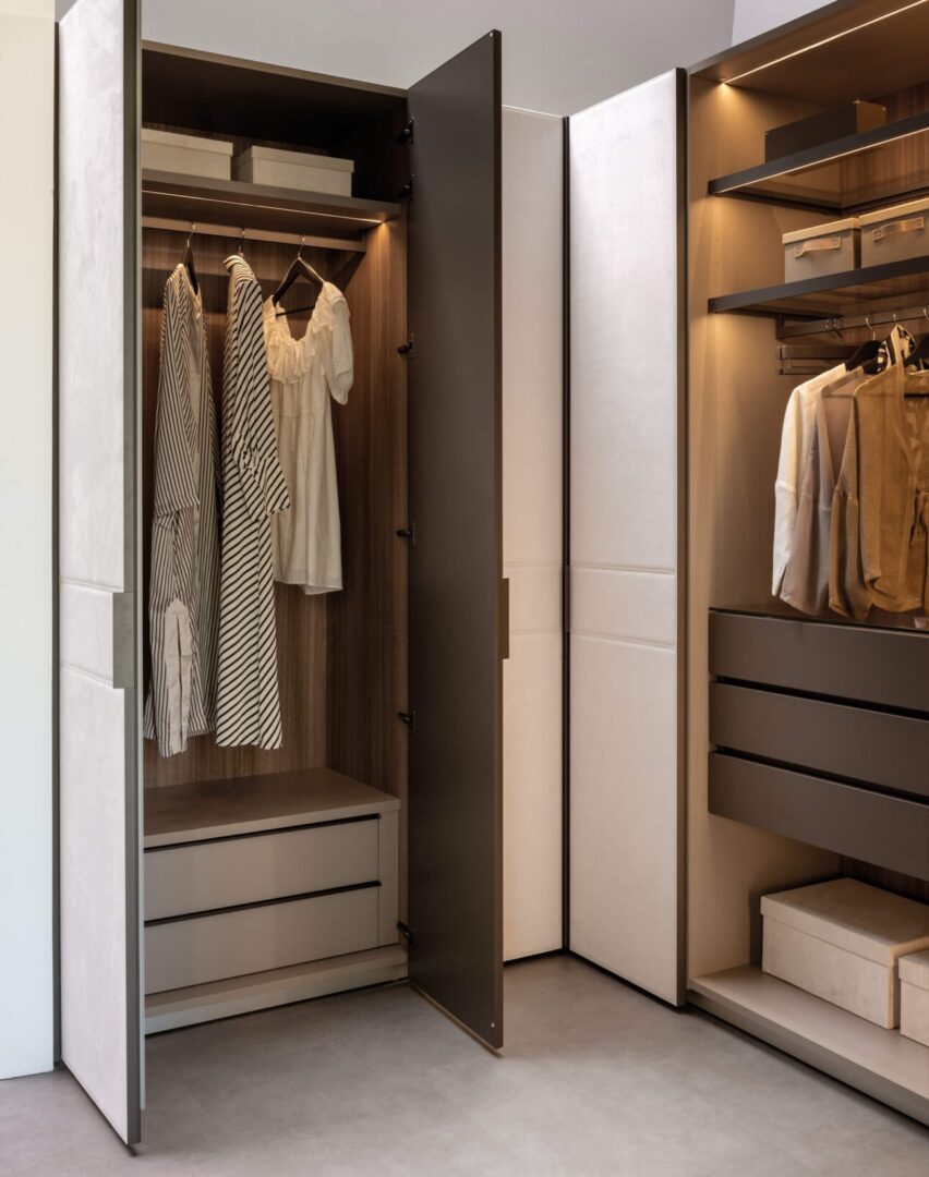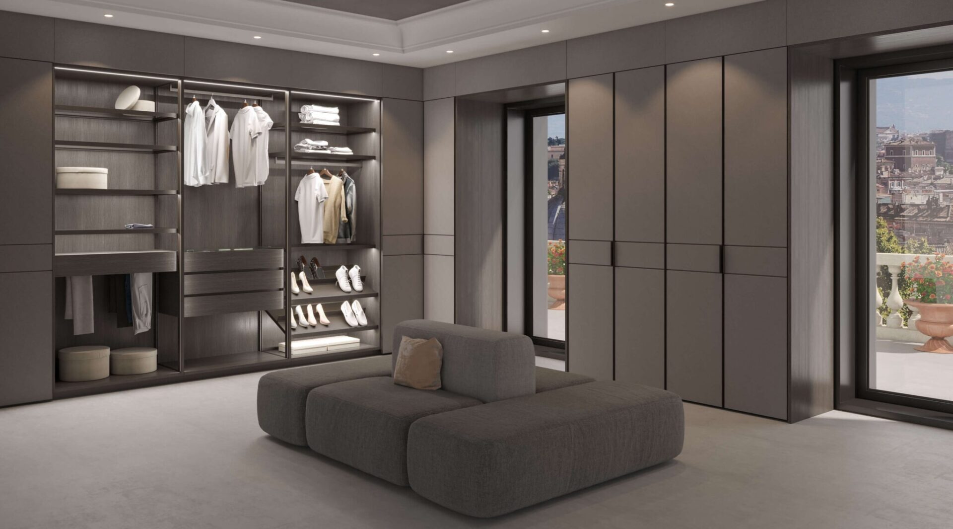 Современная, легко настраиваемая гардеробная, которую можно комбинировать с различными шкафами-купе с распашными дверцами для защиты аксессуаров и одежды. Широкий выбор фурнитуры обеспечивает функциональность, практичность и стиль.
