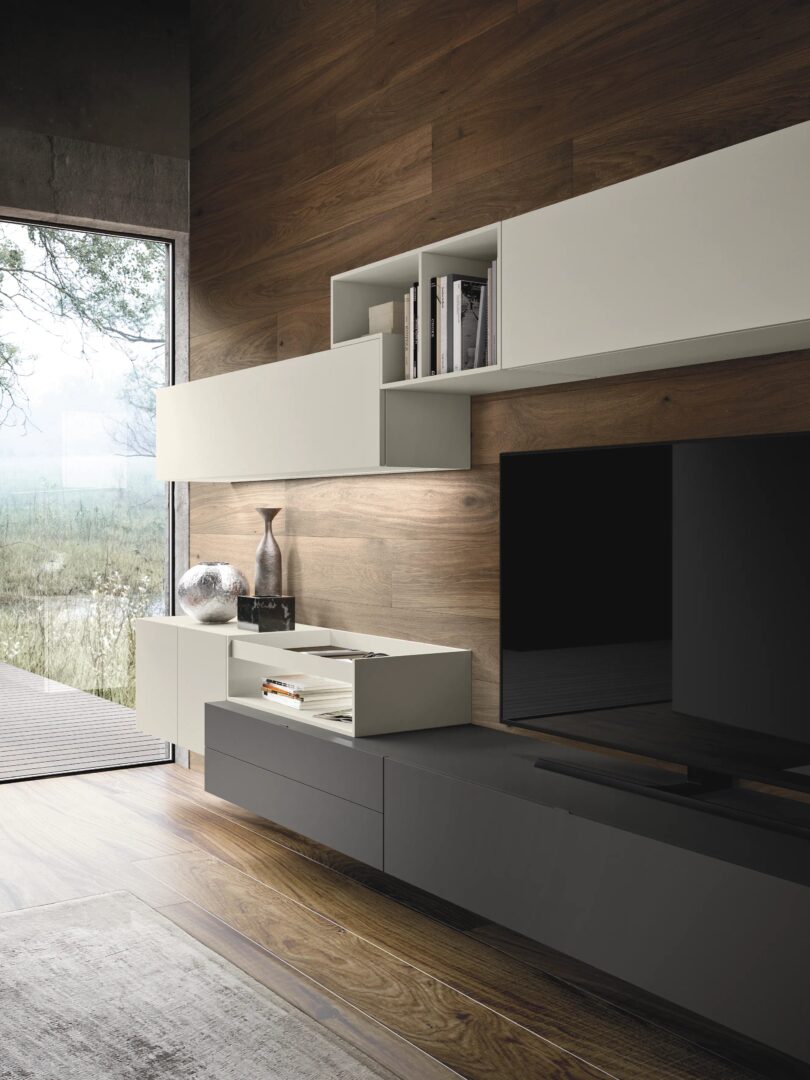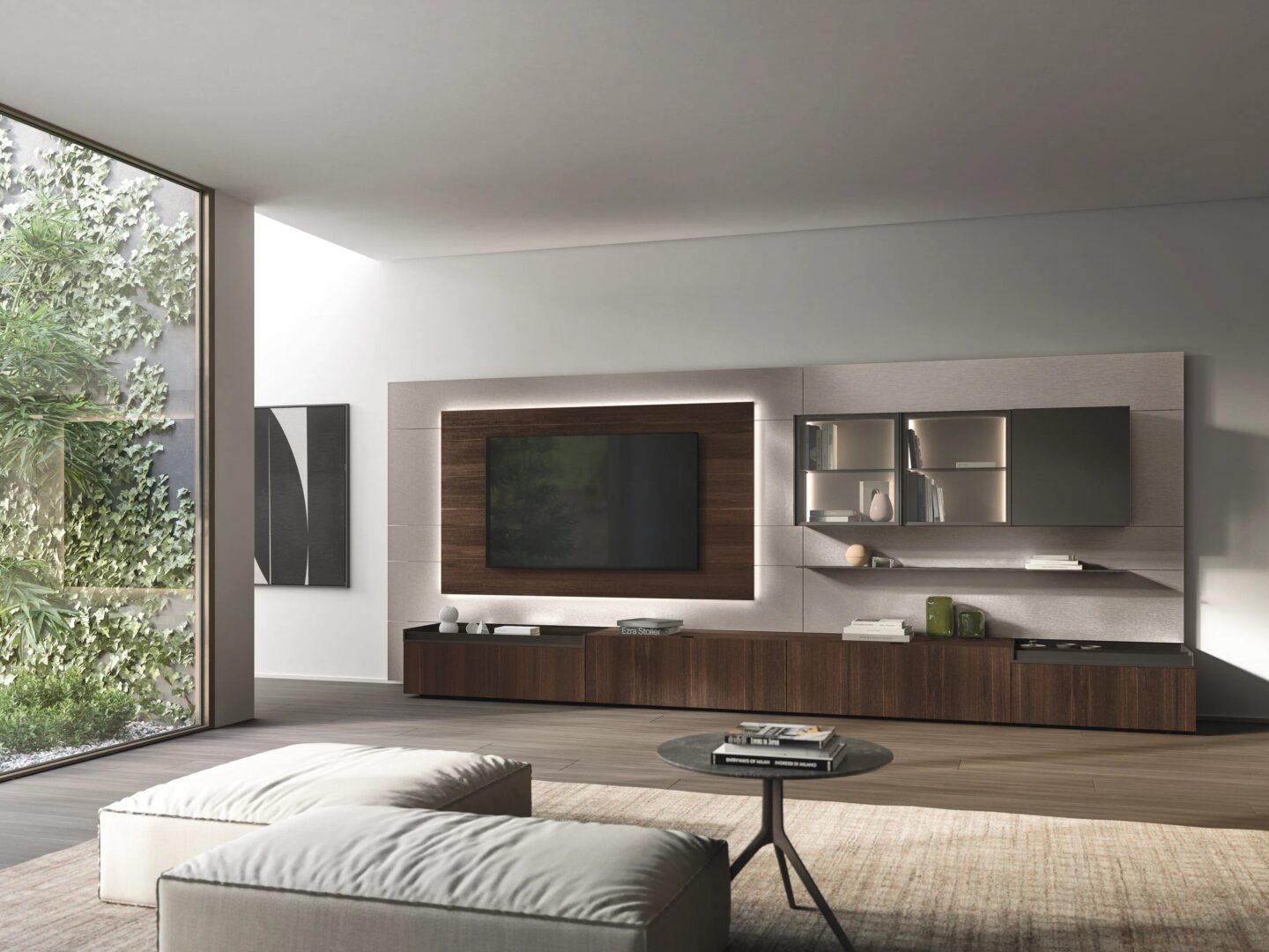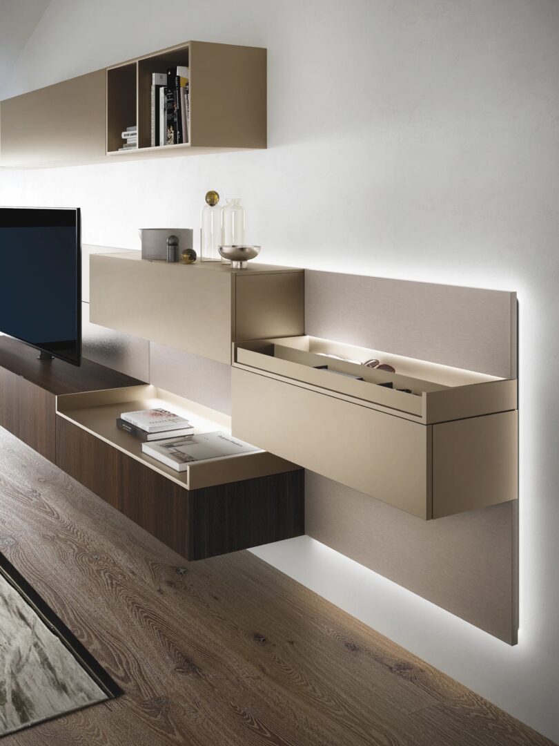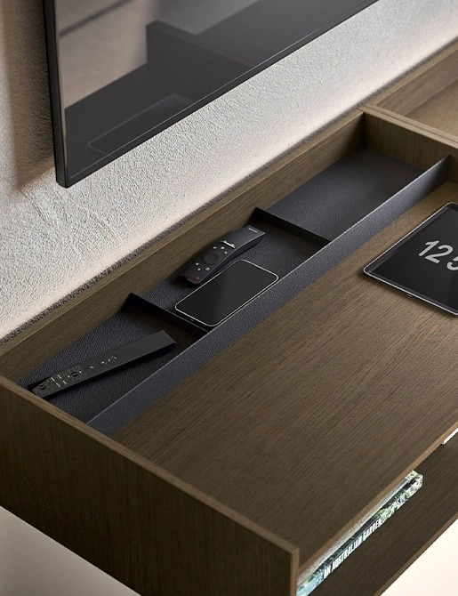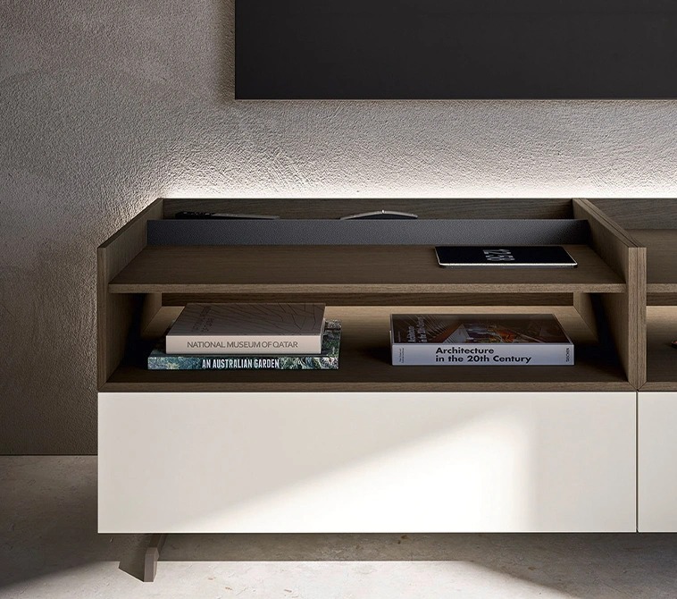Подвесные основания молнии, облицованные термообработанным дубом в сочетании с модульными лотками H 80 мм из палладиевого лака. Обшивка молнии sp 25 мм из материала Sketch Rock, настенные шкафы из палладиевого лака. Светодиодная подсветка на основаниях и обшивке; горизонтальные светодиоды для удобных лотков.