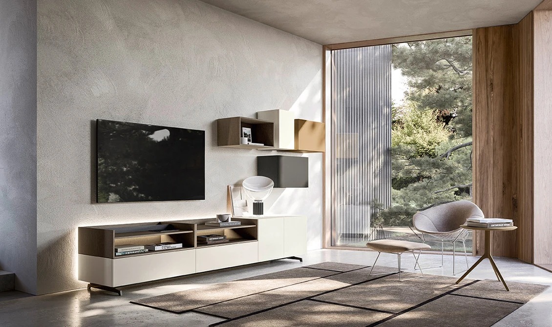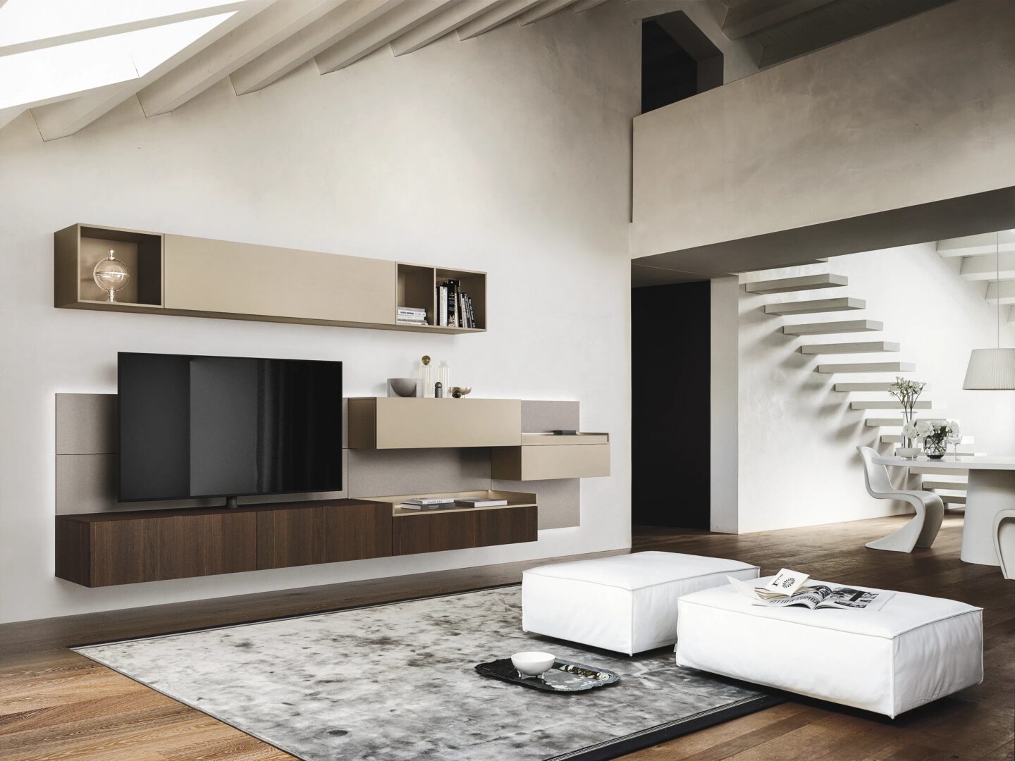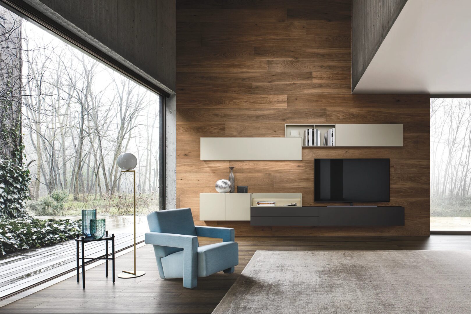 Подвесные основания молнии, облицованные термообработанным дубом в сочетании с модульными лотками H 80 мм из палладиевого лака. Обшивка молнии sp 25 мм из материала Sketch Rock, настенные шкафы из палладиевого лака. Светодиодная подсветка на основаниях и обшивке; горизонтальные светодиоды для удобных лотков.