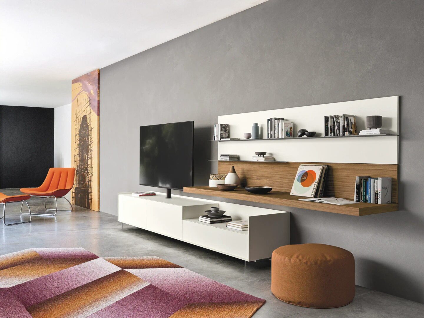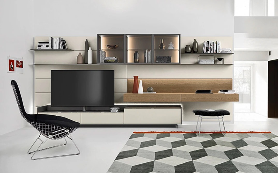 На изображении сбоку мы замечаем основание Cabaret Step с периметром sp 10 мм и элементами из белого матового лака 10. Основание поддерживается подвесным цоколем с футами из метакрилата H 120 мм. Основание с ribalte оснащено поворотной системой подставки для телевизора Vesa в коричневой отделке. Обшивка Lightning sp 25 мм в матовом лаке белого цвета 10, пол sp 60 мм использование письменного стола и нижней панели обшивка шпоном из ореха Каналетто. Свинцовые лакированные металлические полки.