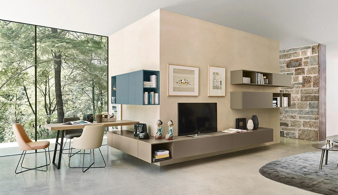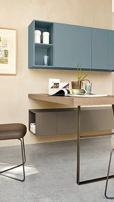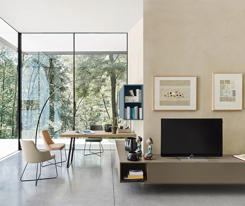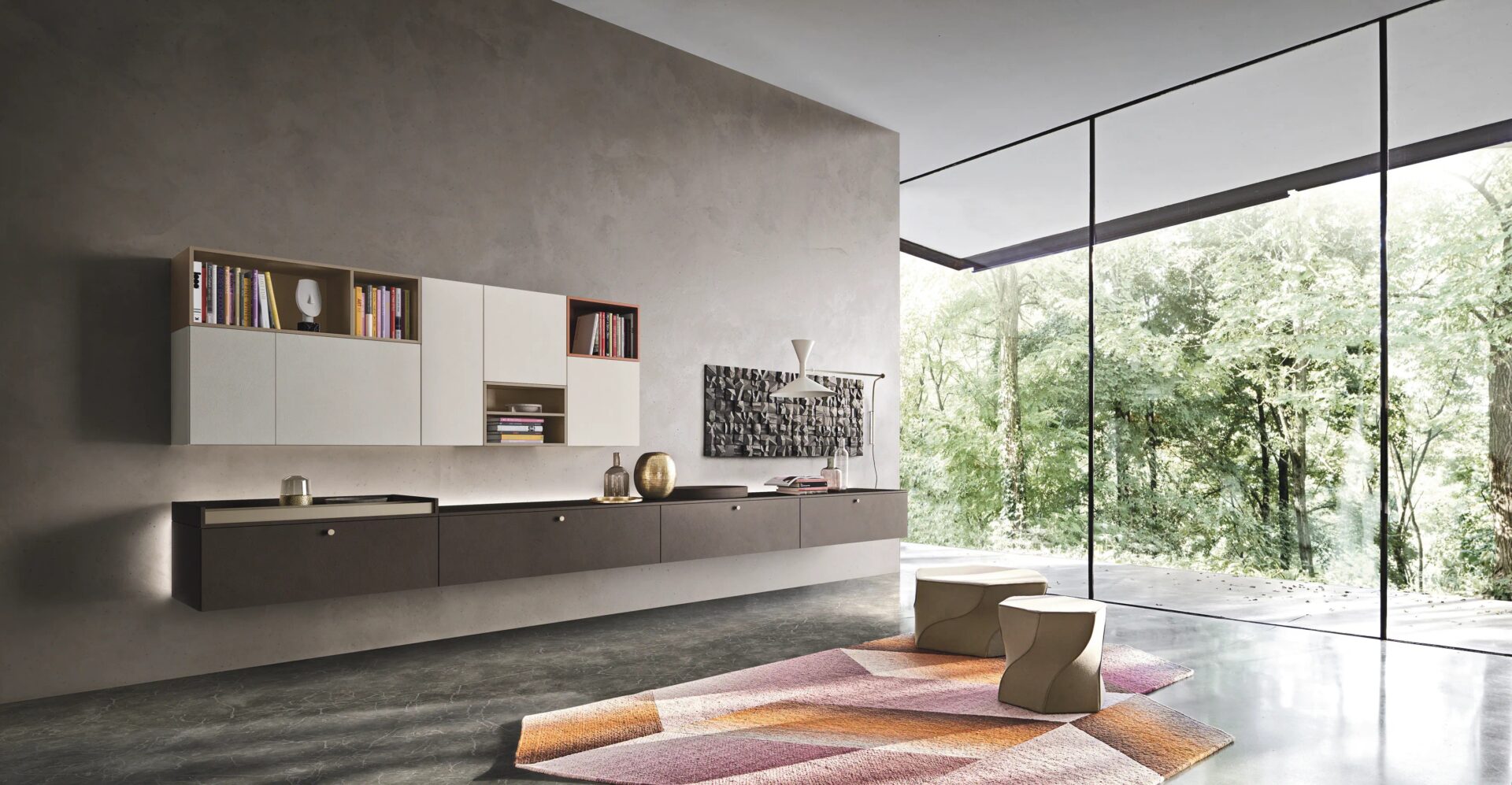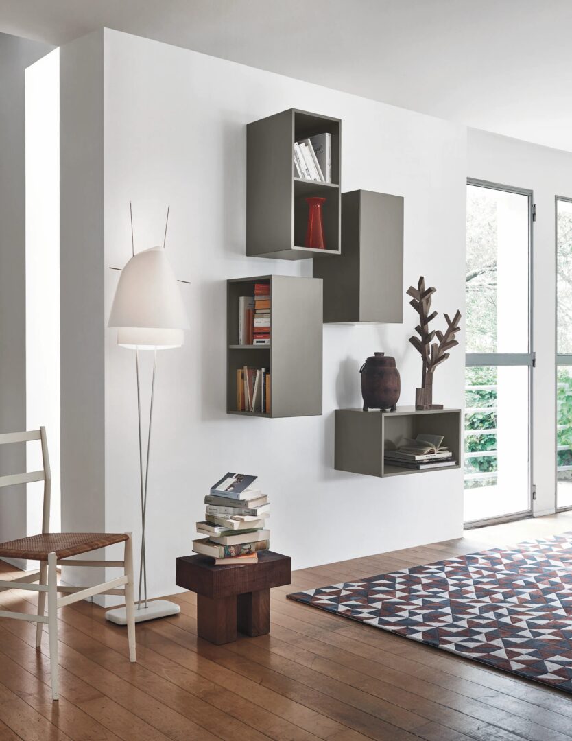 Система, которая открывает новые горизонты в композиционной гибкости, всегда по-разному решая основные потребности живого пространства. Открытые отсеки, выполненные с соединениями под углом 45°, предлагают большой выбор ширины, высоты и глубины для такой же большой модульности.