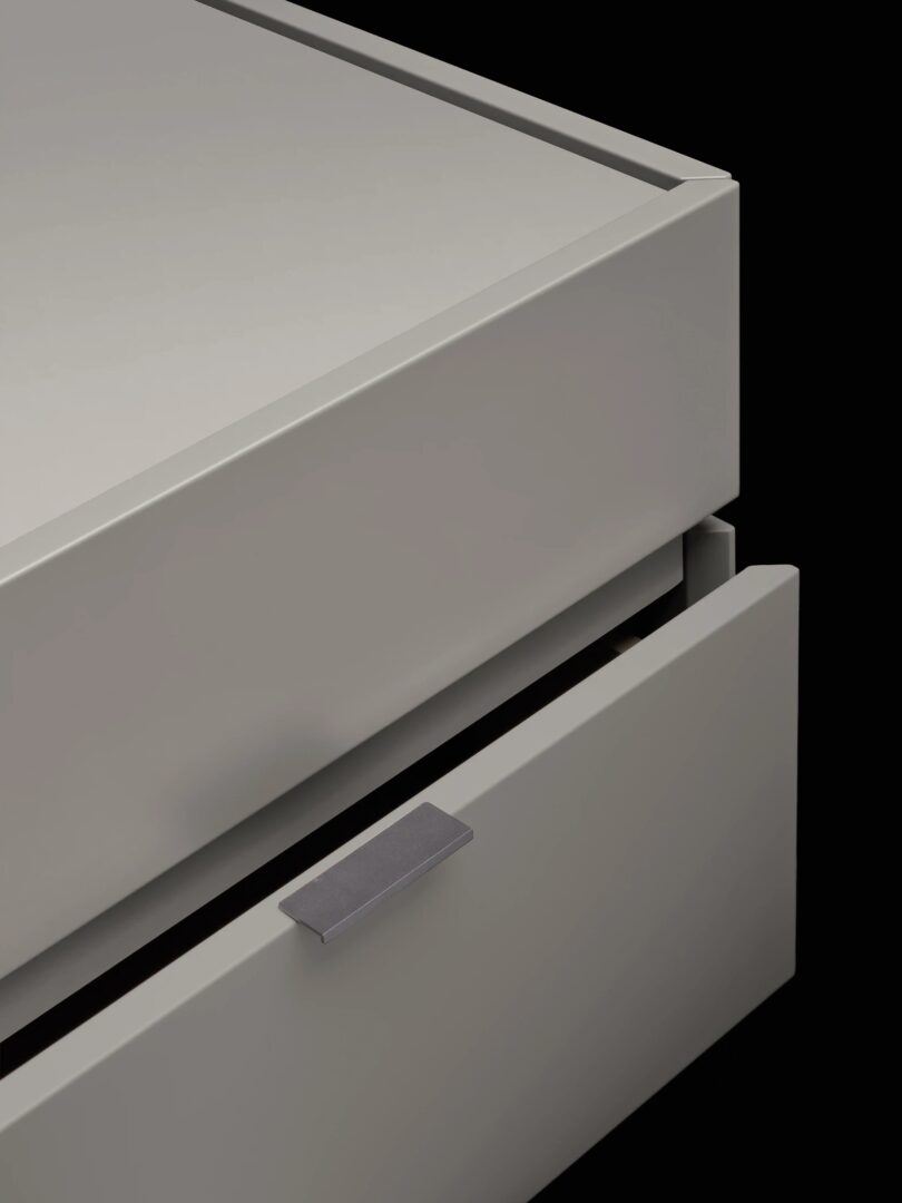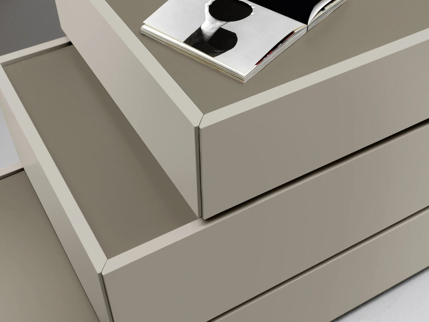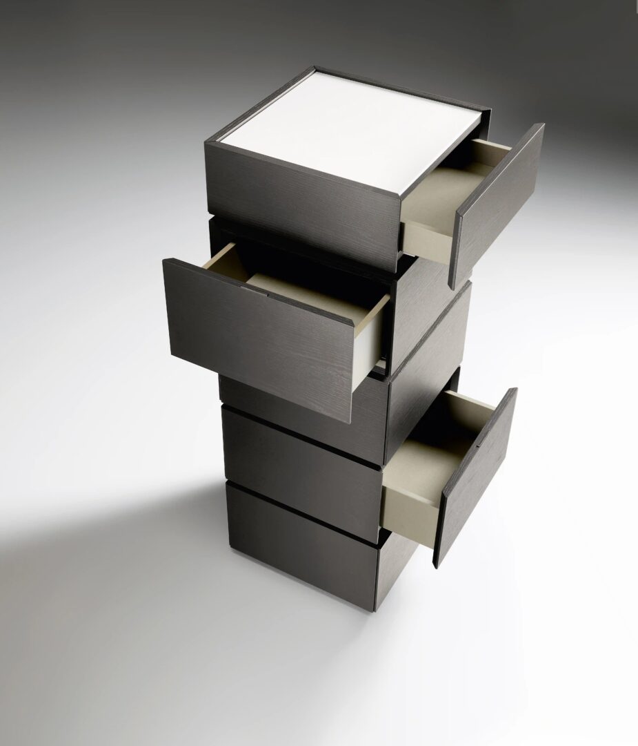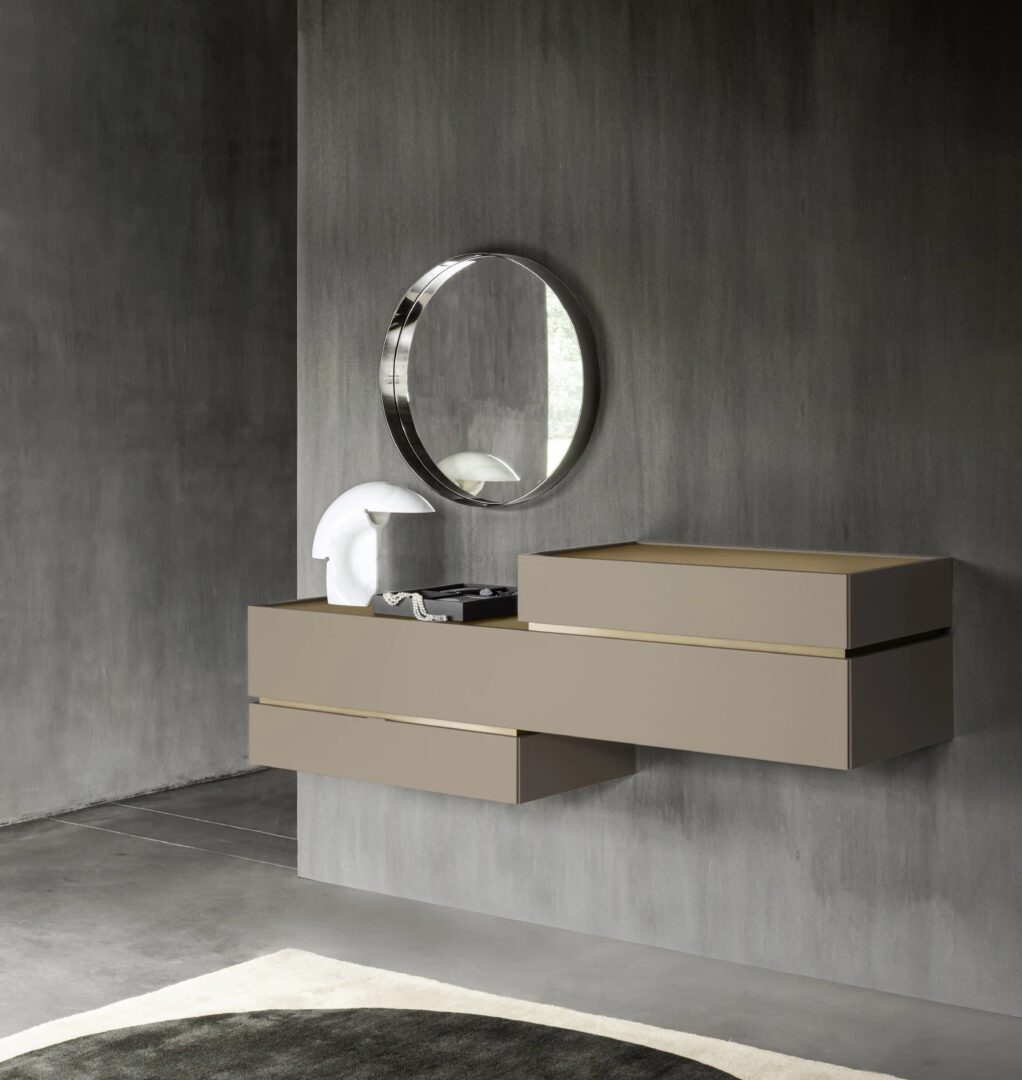 Дизайн контейнеров Cidori характеризуется приподнятыми фасадами и спинками, которые обрамляют, как в настраиваемом контейнере с глянцевой или атласной лакированной стеклянной столешницей.