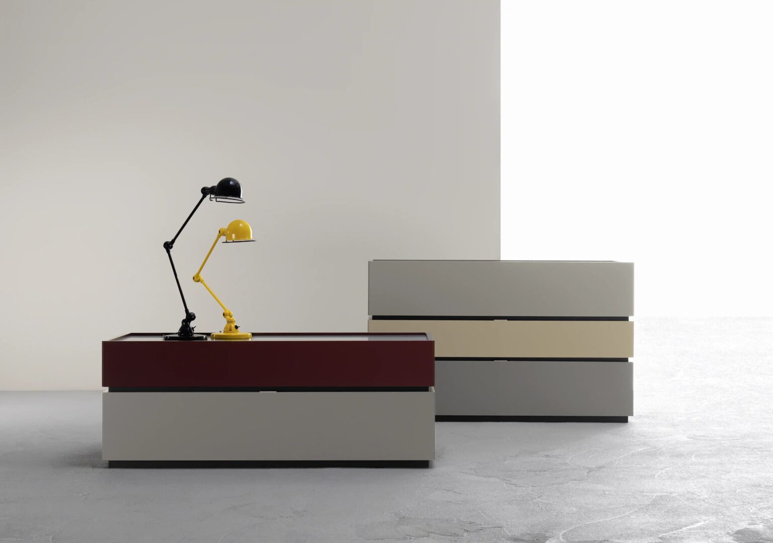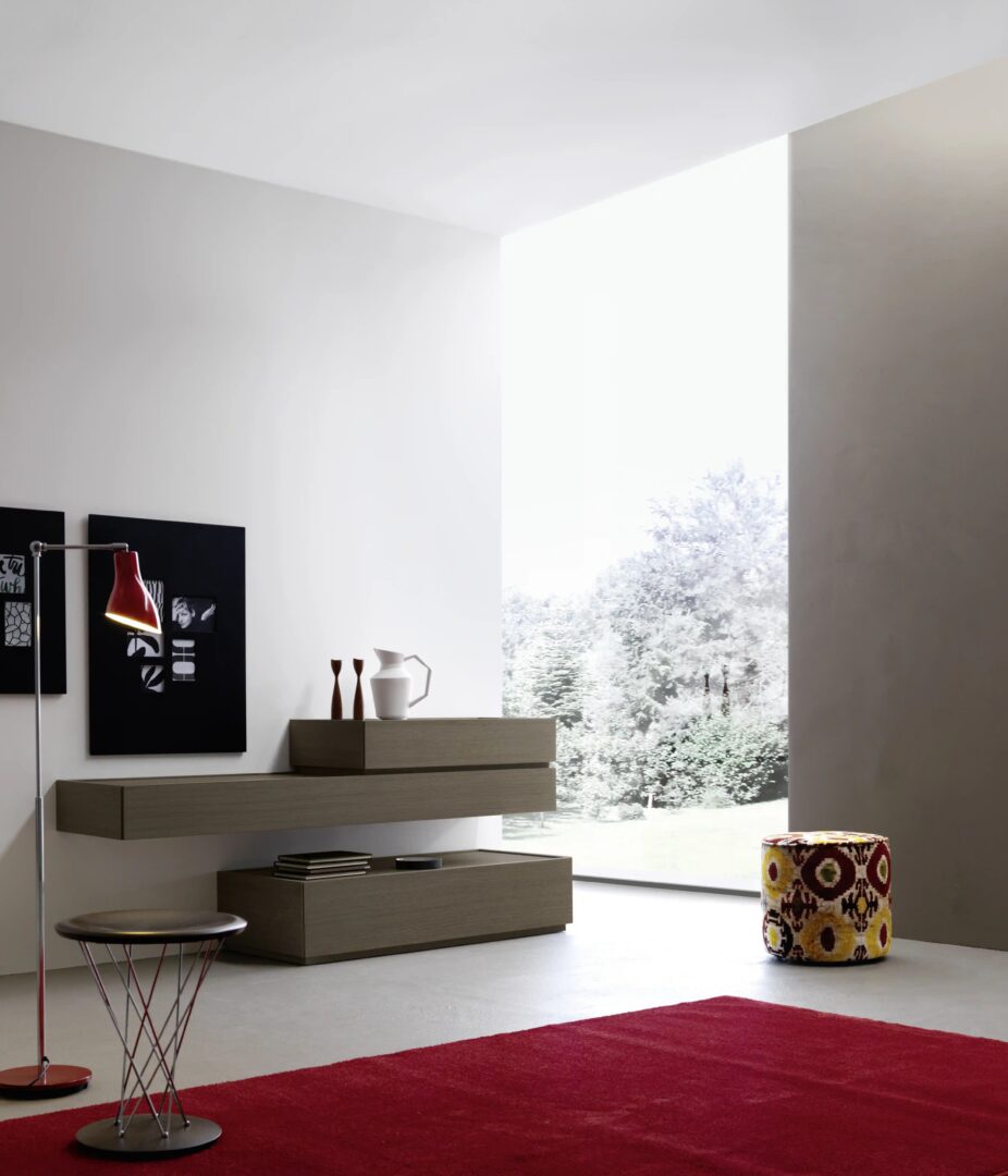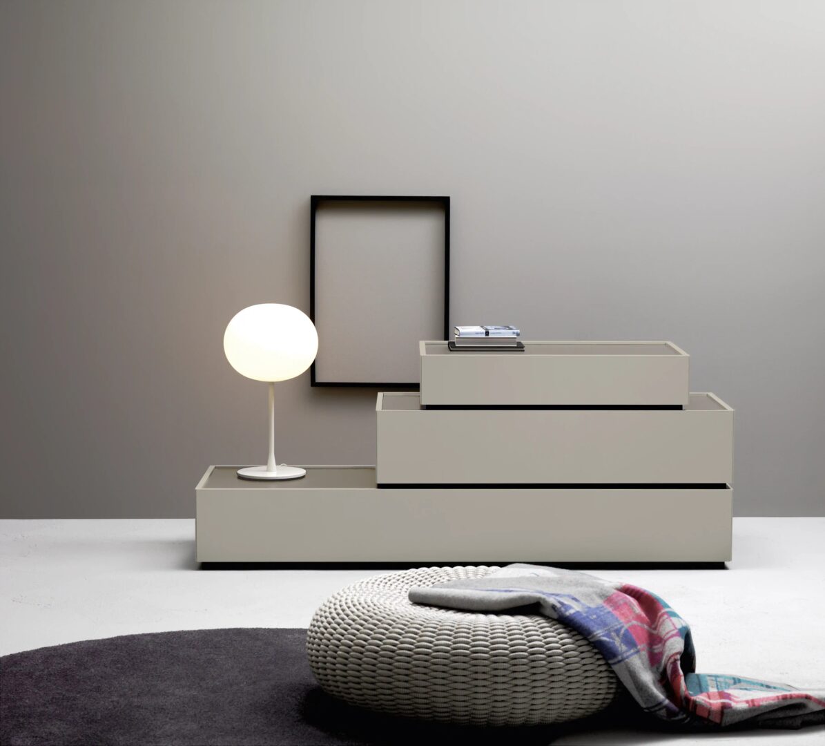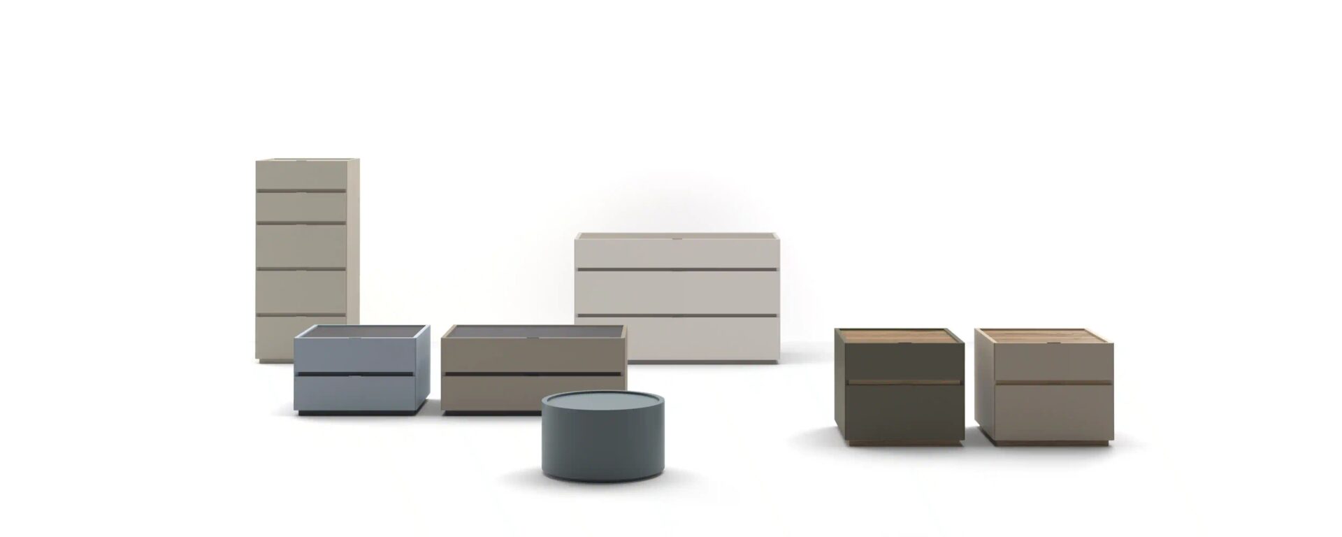 Дизайн контейнеров Cidori характеризуется приподнятыми фасадами и спинками, которые обрамляют, как в настраиваемом контейнере с глянцевой или атласной лакированной стеклянной столешницей.
