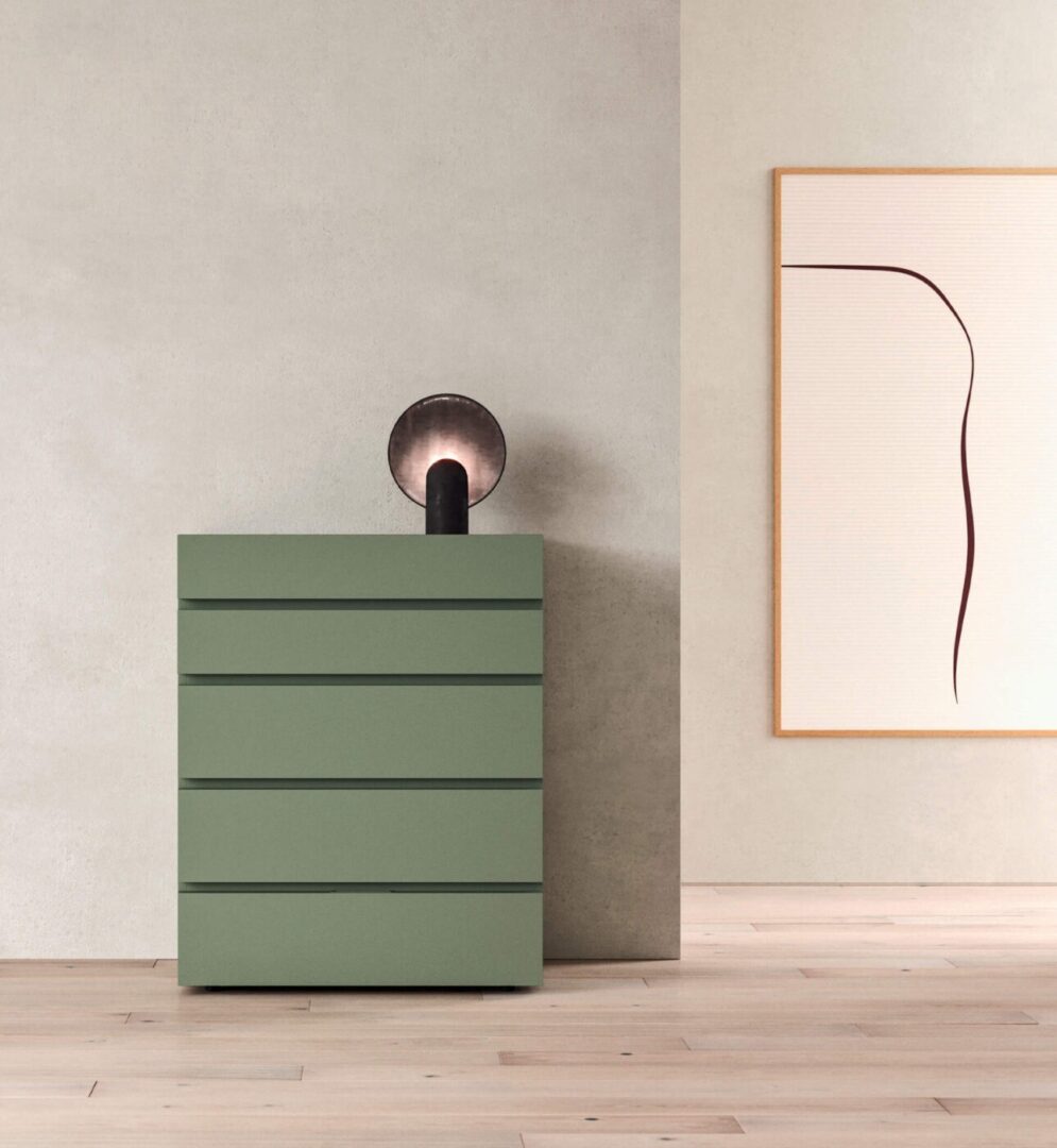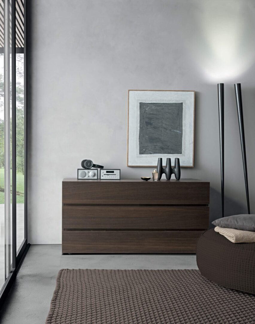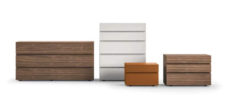 Спальный гарнитур толщиной 40 мм с фасадами из древесностружечных плит, которые могут быть покрыты матовым лаком или отделаны деревом. Каждый шкаф для спальни в этой группе вписывается в интерьер комнаты благодаря линейным фасадам и скрытым ручкам между выдвижными ящиками.