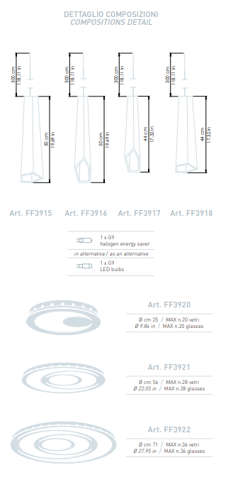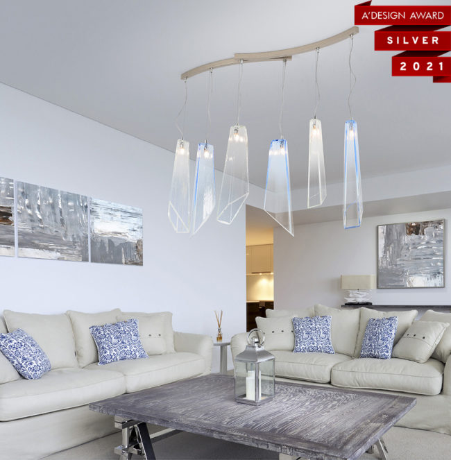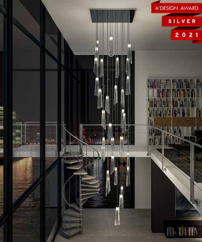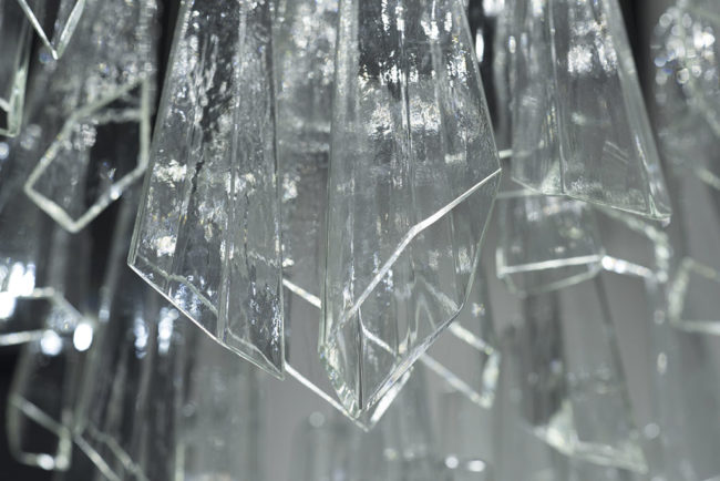 Оригинальные формы из выдувного стекла, предлагаемые с повторяющимися неровными поверхностями различной длины, создание дизайна, которое может предложить элегантные модульные подвески, придавая движение и объем пространствам, которые их содержат, через роскошные люстры из коллекции Crypto от Patrizia Volpato.