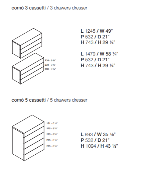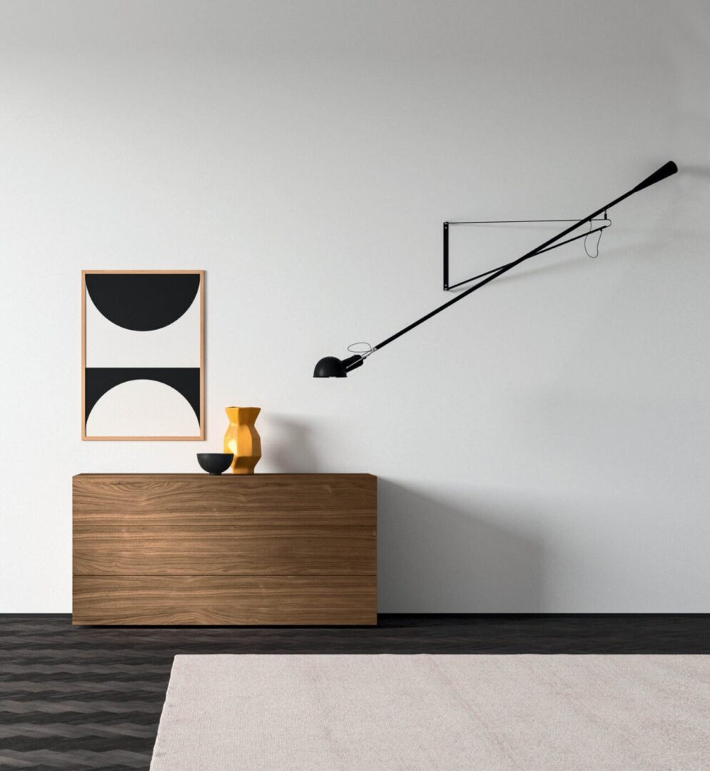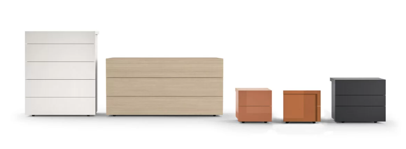 Спальный гарнитур со структурой и фасадами из древесностружечных панелей, характеризующийся 45-градусным стыком между столешницей и фасадами толщиной 40 мм, которые выступают в стороны.
