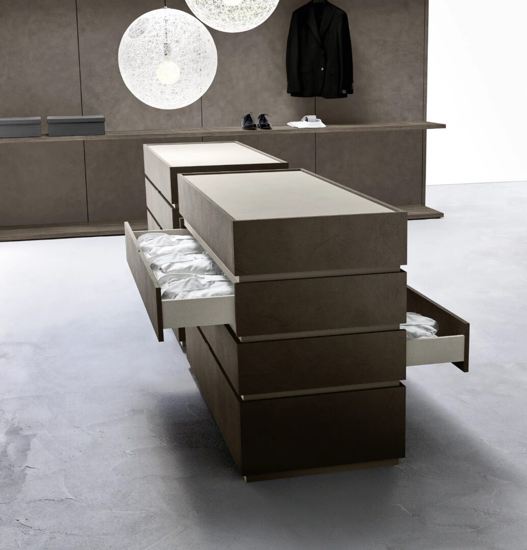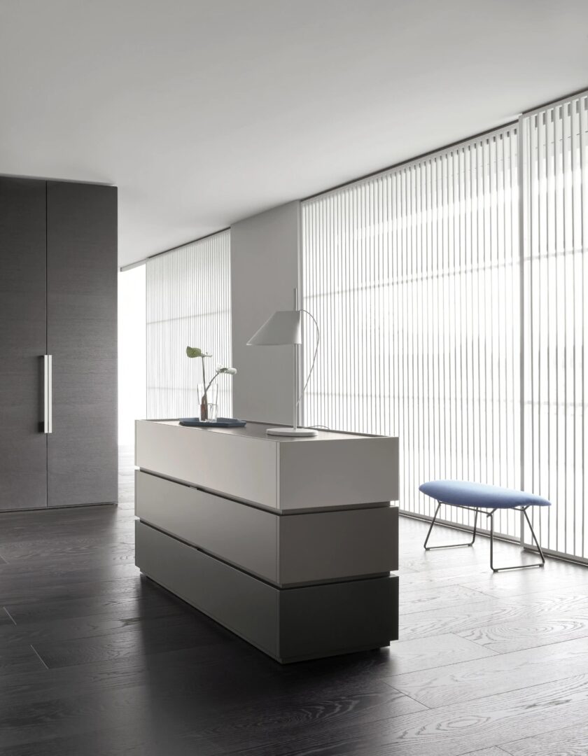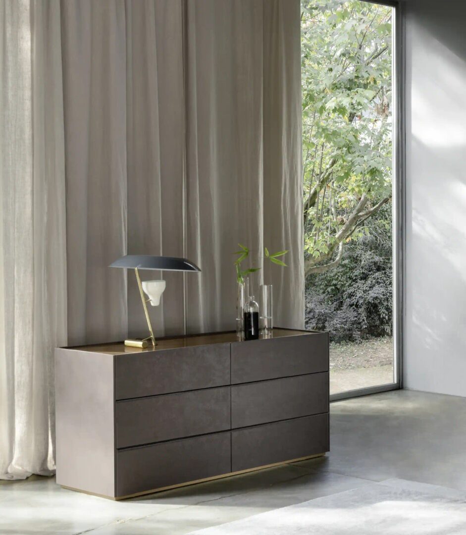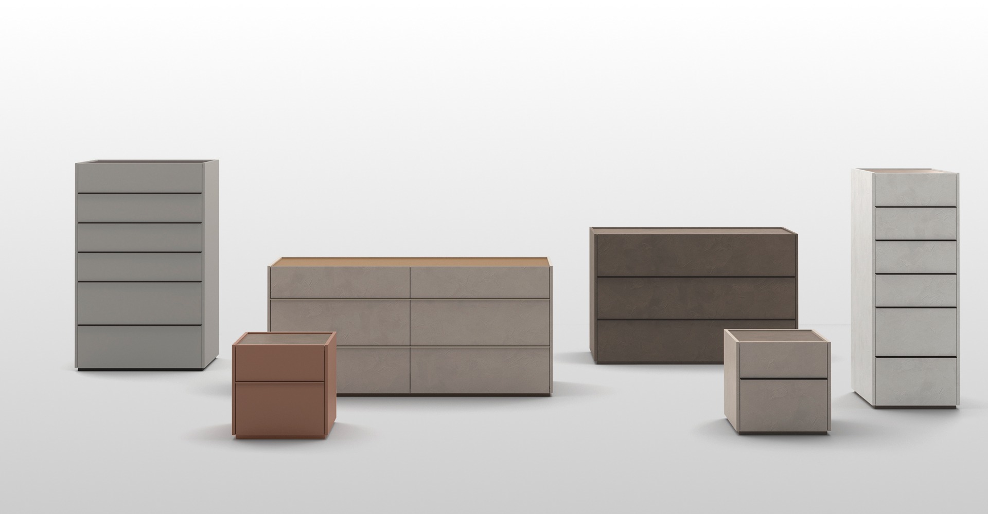 Дизайн прикроватных тумб и комодов линии Filo Mono выражается в современном и существенном языке, в котором сверху и боковины ящиков имеют текстурную и лакированную отделку.