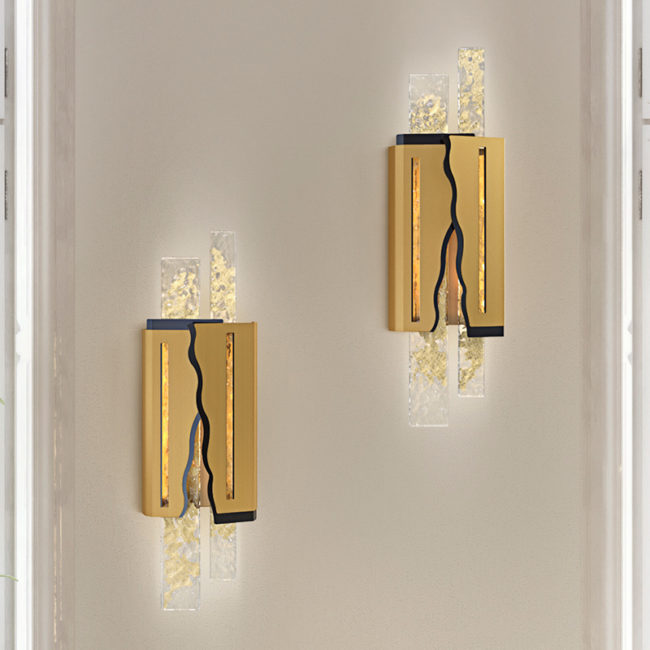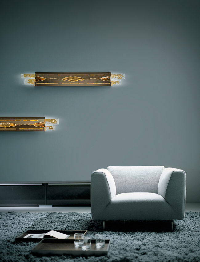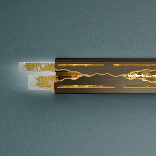Скульптуры, созданные сочетанием стержней из кованого стекла и украшенные сусальным золотом, с металлом, сформированным лазером, сочетанием прозрачности и цветов, которые обогащают творения однородностью и гармонией.